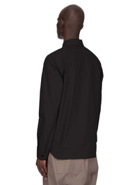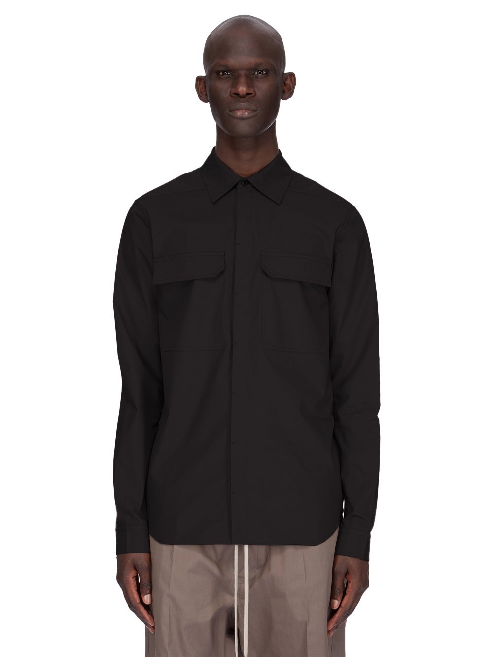 RICK OWENS SS25 HOLLYWOOD WORK SHIRT IN BLACK COTTON POPLIN THIS WORK SHIRT IS HIP LENGTH WITH LONG SLEEVES AND SINGLE BUTTON CUFFS. IT HAS A FRONT OPENING WITH CONCEALED BUTTON CLOSURES, ONE VISIBLE TOP BUTTON, A CLASSIC COLLAR, LEVEL SHOULDER SEAMS, AND A BACK YOKE. IT FEATURES TWO CHEST POCKETS WITH BEVELED FLAPS AND DOUBLE TOPSTITCHING AND A HEMLINE WITH BEVELED SIDE SPLITS THIS LIGHTWEIGHT CLASSIC POPLIN FABRIC HAS A SOFT HANDFEEL AND WASHED FINISH. THIS FABRIC IS MADE USING GOTS CERTIFIED ORGANIC COTTON WHICH MEANS THE NATURAL FIBER IS GROWN WITHOUT HARMFUL CHEMICALS, LEAVING OUR SOIL, AIR AND WATER CLEANER FROM CONTAMINATES COLOR: BLACK MATERIAL: 100% COTTON BUTTONS 100% BUFFALO HORN MODEL IS 189CM TALL MODEL WEARS SIZE 48