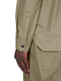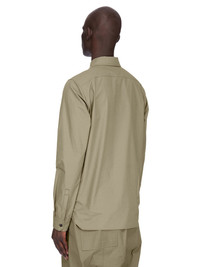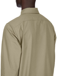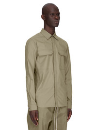 RICK OWENS SS25 HOLLYWOOD WORK SHIRT IN CELADON COTTON POPLIN THIS WORK SHIRT IS HIP LENGTH WITH LONG SLEEVES AND SINGLE BUTTON CUFFS. IT HAS A FRONT OPENING WITH CONCEALED BUTTON CLOSURES, ONE VISIBLE TOP BUTTON, A CLASSIC COLLAR, LEVEL SHOULDER SEAMS, AND A BACK YOKE. IT FEATURES TWO CHEST POCKETS WITH BEVELED FLAPS AND DOUBLE TOPSTITCHING AND A HEMLINE WITH BEVELED SIDE SPLITS THIS LIGHTWEIGHT CLASSIC POPLIN FABRIC HAS A SOFT HANDFEEL AND WASHED FINISH. THIS FABRIC IS MADE USING GOTS CERTIFIED ORGANIC COTTON WHICH MEANS THE NATURAL FIBER IS GROWN WITHOUT HARMFUL CHEMICALS, LEAVING OUR SOIL, AIR AND WATER CLEANER FROM CONTAMINATES COLOR: CELADON MATERIAL: 100% COTTON BUTTONS 100% BUFFALO HORN MODEL IS 189CM TALL MODEL WEARS SIZE 48