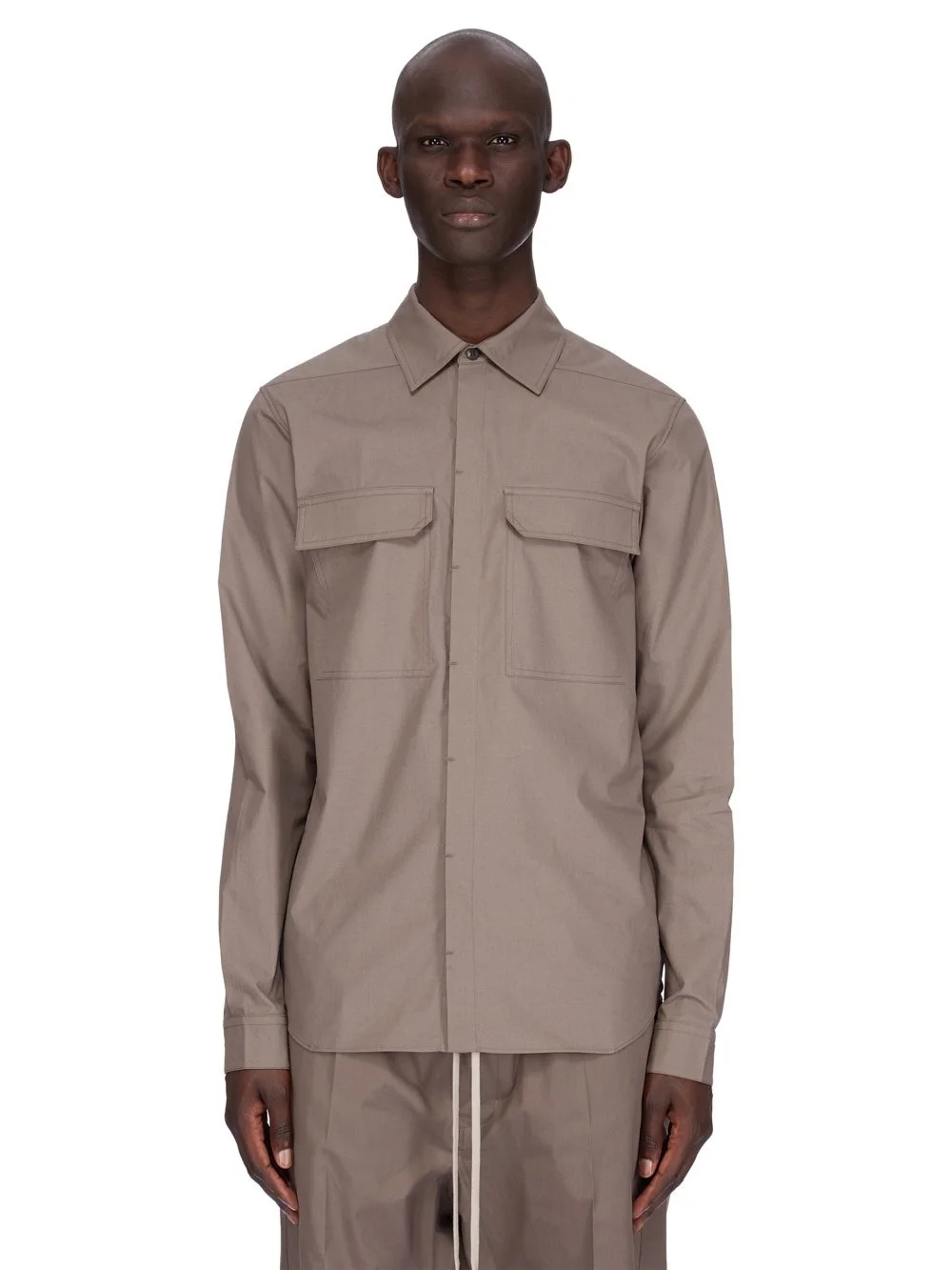 RICK OWENS SS25 HOLLYWOOD WORK SHIRT IN DUST COTTON POPLIN THIS WORK SHIRT IS HIP LENGTH WITH LONG SLEEVES AND SINGLE BUTTON CUFFS. IT HAS A FRONT OPENING WITH CONCEALED BUTTON CLOSURES, ONE VISIBLE TOP BUTTON, A CLASSIC COLLAR, LEVEL SHOULDER SEAMS, AND A BACK YOKE. IT FEATURES TWO CHEST POCKETS WITH BEVELED FLAPS AND DOUBLE TOPSTITCHING AND A HEMLINE WITH BEVELED SIDE SPLITS THIS LIGHTWEIGHT CLASSIC POPLIN FABRIC HAS A SOFT HANDFEEL AND WASHED FINISH. THIS FABRIC IS MADE USING GOTS CERTIFIED ORGANIC COTTON WHICH MEANS THE NATURAL FIBER IS GROWN WITHOUT HARMFUL CHEMICALS, LEAVING OUR SOIL, AIR AND WATER CLEANER FROM CONTAMINATES COLOR: DUST MATERIAL: 100% COTTON BUTTONS 100% BUFFALO HORN MODEL IS 189CM TALL MODEL WEARS SIZE 48