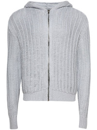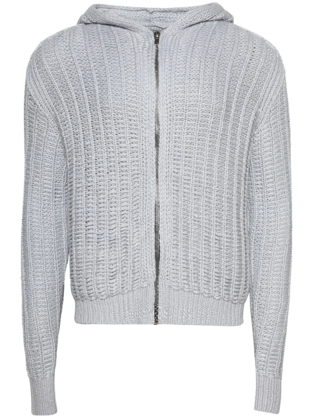 knitted hoodie Highlights - Blue-grey - Front zip fastening - Slouchy hood - Long sleeves - Ribbed cuffs and hem Imported Composition Recycled Cashmere 97%, Wool 3% SIZE & FIT FittingInformation Designed to be unstructured, offering a loose fit throughout The ribbed hem offers a close, comfortable fit Made with a midweight knit, this piece offers some stretch