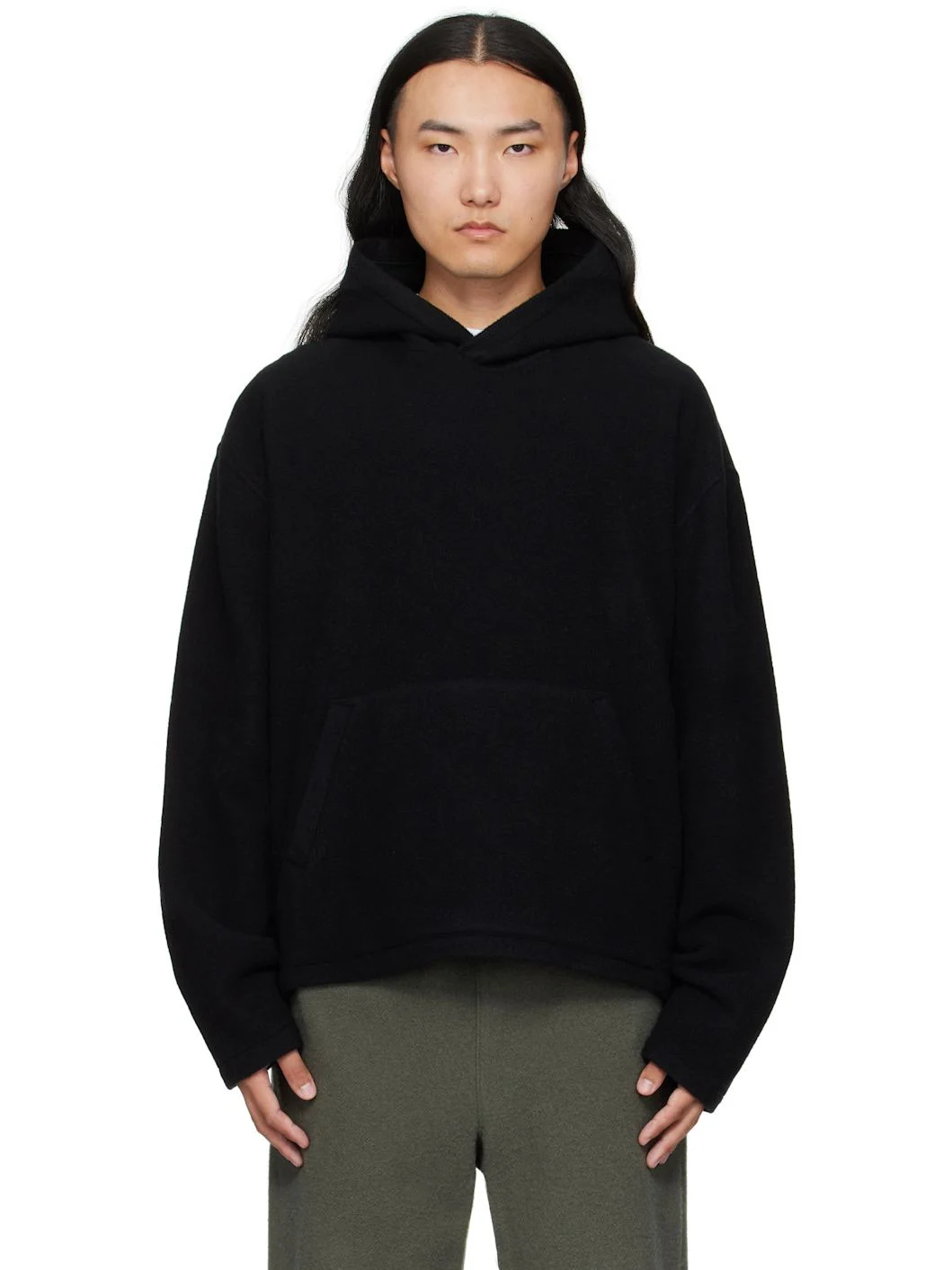 Lightweight brushed virgin wool fleece hoodie. · Kangaroo pocket · Dropped shoulders · Locker loop at back yoke Supplier color: Black 100% virgin wool. Made in Austria 252661M202007