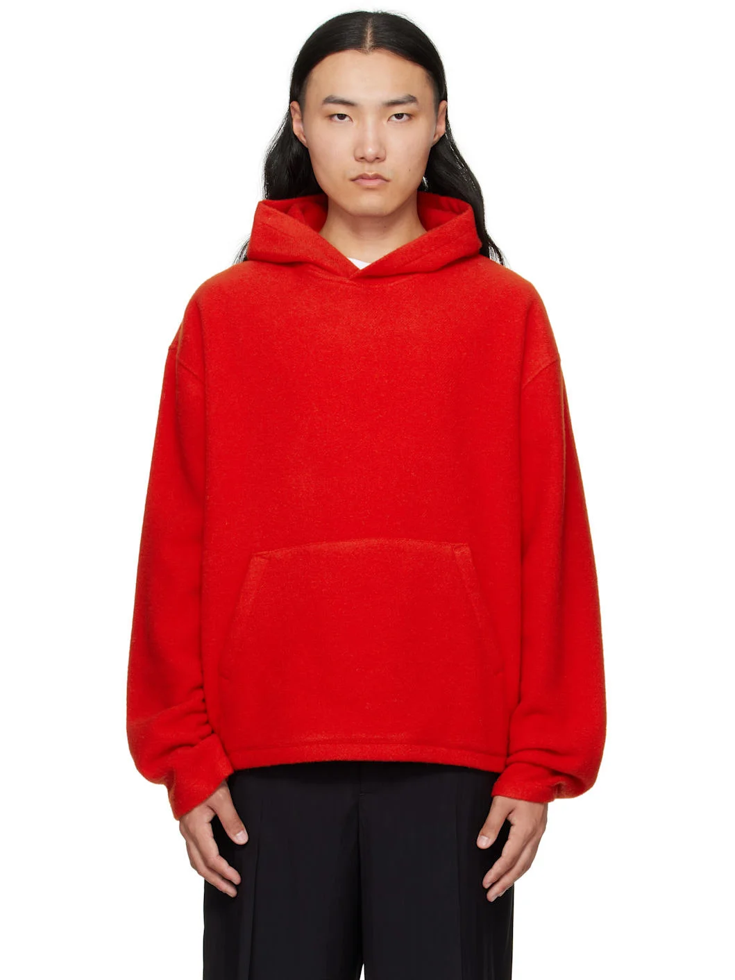 Lightweight brushed virgin wool fleece hoodie. · Kangaroo pocket · Dropped shoulders · Locker loop at back yoke Supplier color: Orange 100% virgin wool. Made in Austria 252661M202013