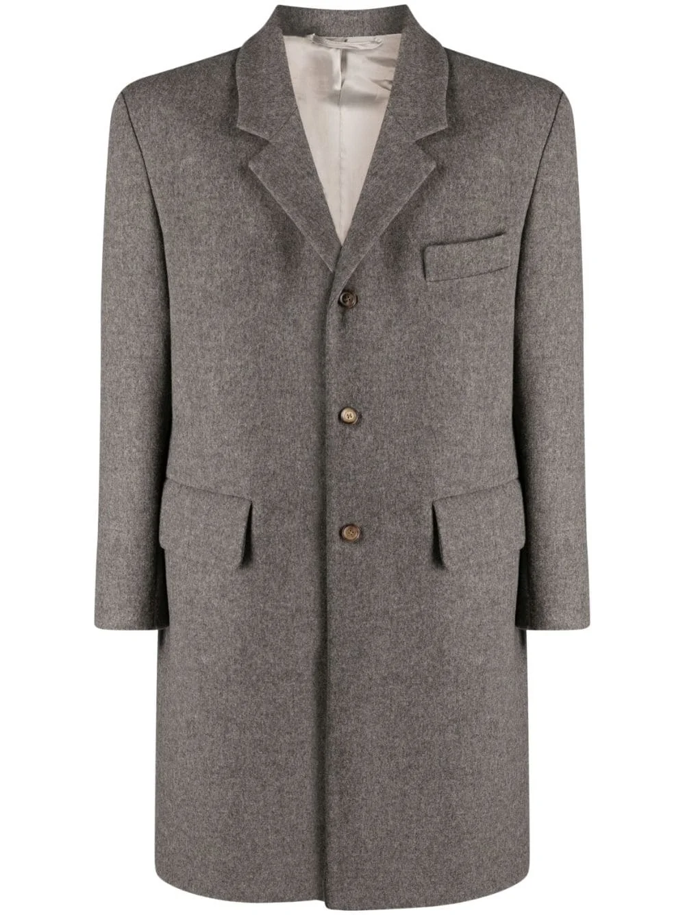 single-breasted wool coat Highlights - Anthracite grey - Wool - Notched collar - Front button fastening - Two side flap pockets - Chest patch pocket - Long sleeves - Knee-length - Straight hem Imported Composition Wool 100% SIZE & FIT Model measurements Height 6 ft 1 in(1.85 m) Bust/Chest 35.82 in(91 cm) Hips 37.79 in(96 cm) Waist 29.13 in(74 cm)