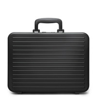 A reimagined classic, the RIMOWA Aluminum Attaché case in Black pairs a vintage sensibility with minimalist design as it revives the briefcase for a new generation. Crafted in Köln, Germany, the Attaché’s sleek design features an anodized aluminum surface embossed with RIMOWA’s iconic grooves and smooth, rounded edges. Made for contemporary business use, its luxurious black matte leather interior has a flat pocket and two large gusseted compartments to carry documents and a laptop up to 16 inches. The ergonomic aluminum handle means the briefcase can be comfortably carried while an integrated combination lock keeps contents safe. Video: The model is 175cm-5'7". Key elements Handle The ergonomically designed aluminum handle folds back in place without noise. Lock system A secured metallic lock system that's fully integrated into the shell. Gusseted pockets Two, large guesseted compartments hold up to a 16 inch computer and are neatly kept in place by magnets when not in use. Feet Four aluminum feet ensure a well-maintained vertical position. Made in black aluminum, matching the handle. Size and Weight Measurement 13.78 x 16.34 x 3.35 inch Weight 5.07 lbs Volume 0.18 gal Materials Exterior : Anodized Aluminum Interior : Leather Handles : Anodized Aluminum Feet : Anodized Aluminum Gusseted pockets : Leather