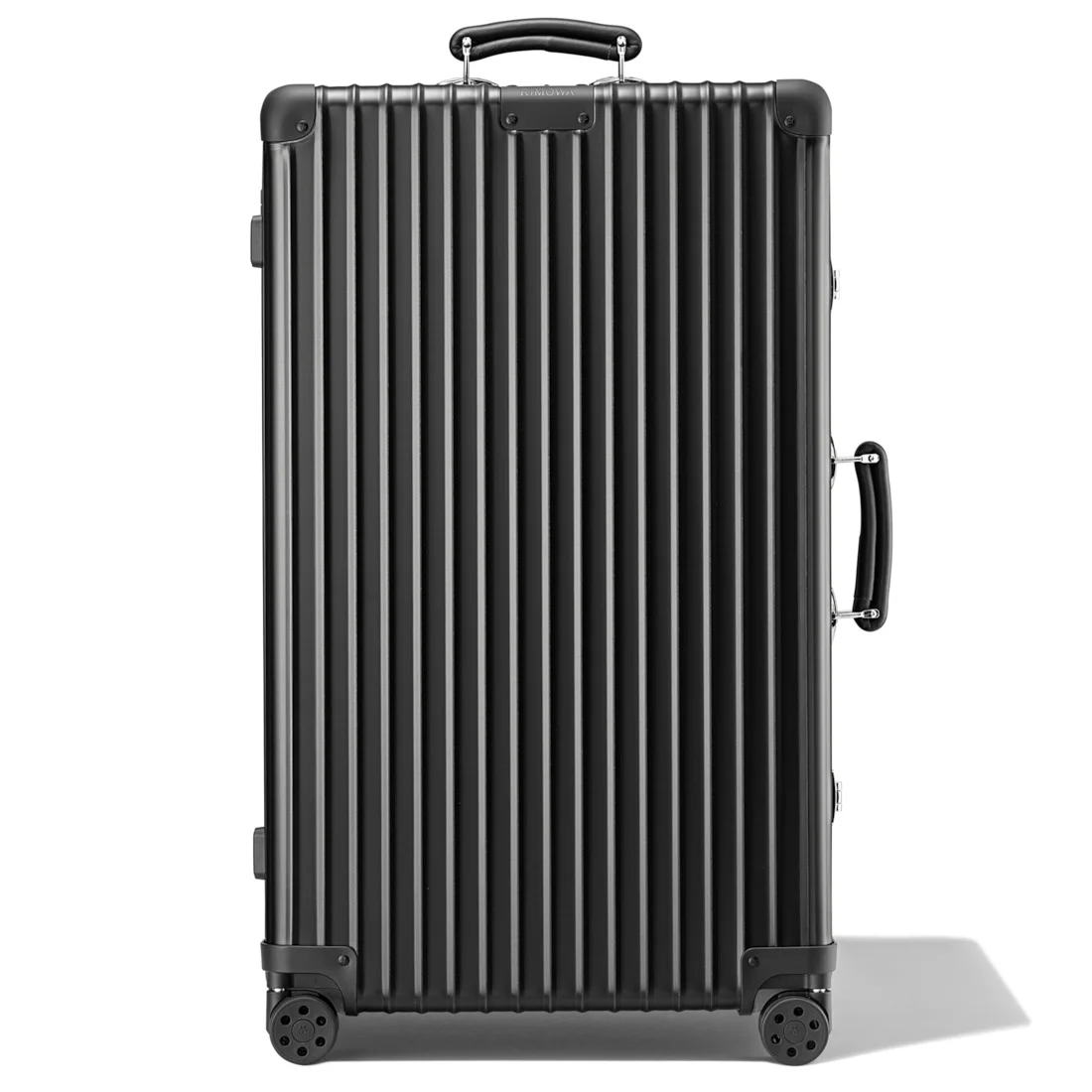 Designed for the most discerning travelers, the RIMOWA Classic Trunk in matte black effortlessly combines luxury with functionality. Rooted in heritage, each RIMOWA Classic features a high-end anodized aluminum alloy, riveted matte black aluminum corners, and hand-made leather handles. Creating the perfect balance between craftsmanship and superior engineering, this large 4 wheel aluminum suitcase provides enough room for journeys of up to 14 days. Designed and engineered in Germany. Includes a complimentary leather luggage tag and sticker set. Key elements TSA-Approved Locks Each of our suitcases features TSA-approved locks that can be opened by security during airline baggage checks without causing any damage. Flex Divider Packed items are kept in perfect order during transit with the height adjustable Flex Divider, which can be adapted to suit your belongings. Multiwheel® System Pioneered by RIMOWA, this high-end system guarantees stable and effortless steering thanks to ball-bearing mounted wheels with cushioned axels. Telescopic Handle Engineered to offer a stageless handle for custom height adjustment and an ergonomic grip with a leather insert on the underside for optimum comfort. Size and Weight Measurement 29,5 x 14,2 x 18,5 INCH Weight 13,2 Lbs Volume 26,4 Gal Materials Outside : Aluminium Inside : Polyester Handles : Leather Wheels: Hard plastic Dividers: Polyester