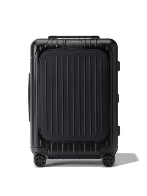 Made of high-performance polycarbonate, the RIMOWA Essential Sleeve collection offers a versatile option for business travel and beyond. Designed to be highly practical, it offers quick access and protection to belongings, making it the ultimate companion for those constantly on the move. Ideal for 3 to 4 days of travel, the RIMOWA Essential Sleeve Cabin in Matte Black features a number of ingenious functionalities: - Padded front pocket - Stage-free telescopic handle - RIMOWA Multiwheel® System - TSA-approved locks - Dual-organization interior Includes a complimentary leather luggage tag and a sticker. Designed in Germany. Produced in our RIMOWA factories. Video: The models are 189cm-6'2" tall (man) and 175cm-5'7" tall (woman). Key elements TSA-Approved Locks Each of our suitcases features TSA-approved locks that can be opened by security during airline baggage checks without causing any damage. Front Pocket Water-resistant and padded, it provides easy access and protection for a 16-inch laptop, and flat-pack essentials such as mobile phones and documents. Interior Organization The interior features a fully zipped compartment to contain all your belongings, a large mesh zipped pocket for additional storage, and an adjustable Flex Divider-- RIMOWA’s patented compression system to pack more while keeping items in perfect order during transport. RIMOWA Multiwheel® System Pioneered by RIMOWA, this high-end system guarantees stable and effortless steering thanks to ball-bearing mounted wheels with cushioned axels. Telescopic Handle Engineered to offer seamless stage-free adjustment for maximum comfort and smooth maneuverability. Size and Weight Measurement 21.7 x 15.8 x 9.1 inch Weight 8 lbs Volume 9.8 gal Materials Exterior : Polycarbonate Interior : Polyester & Mesh Handles : Hard wearing plastic Dividers : Polyester Zippers : Plastic and Metal Pocket : Nylon Wheels : Hard wearing plastic