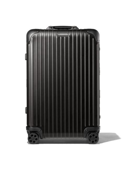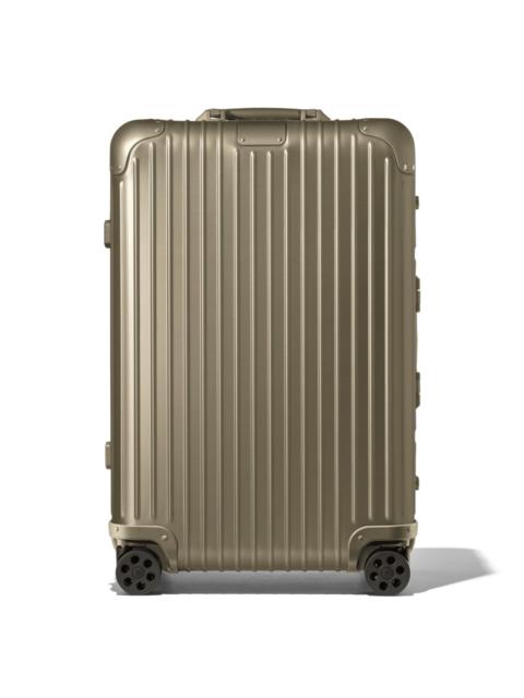 The unmistakable RIMOWA Original aluminum suitcase with its distinctive grooves is regarded as one of the most iconic luggage designs of all time. Made from high-end anodized aluminum, the RIMOWA Original Check-In M in silver is engineered with longevity in mind. Remarkably robust and surprisingly lightweight, this medium sized luggage is an unparalleled example of craftsmanship and innovation and provides the traveler with room for longer journeys of up to 5 days. Designed and engineered in Germany. Includes a complimentary leather luggage tag and sticker set. Key elements TSA-Approved Locks Each of our suitcases features TSA-approved locks that can be opened by security during airline baggage checks without causing any damage. Flex Divider Packed items are kept in perfect order during transit with the height adjustable Flex Divider, which can be adapted to suit your belongings. Multiwheel® System Pioneered by RIMOWA, this high-end system guarantees stable and effortless steering thanks to ball-bearing mounted wheels with cushioned axels. Telescopic Handle Engineered to offer seamless stage-free adjustment for maximum comfort and smooth manoeuvrability. Size and Weight Measurement 26.,4 x 17,8 x 9.5 INCH Weight 11,9 Lbs Volume 15.4 Gal Materials Outside: Aluminum Inside: Cotton Zippers: KK Metal Handles: Plastic Wheels: Polycarbonate Dividers: Cotton