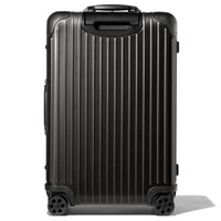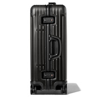The unmistakable RIMOWA Original aluminum suitcase with its distinctive grooves is regarded as one of the most iconic luggage designs of all time. Made from high-end anodized aluminum, the RIMOWA Original Check-In M in black is engineered with longevity in mind. Remarkably robust and surprisingly lightweight, this medium sized luggage is an unparalleled example of craftsmanship and innovation and provides the traveler with room for longer journeys of up to 5 days. Designed and engineered in Germany. Includes a complimentary leather luggage tag and sticker set. Key elements TSA-Approved Locks Each of our suitcases features TSA-approved locks that can be opened by security during airline baggage checks without causing any damage. Flex Divider Packed items are kept in perfect order during transit with the height adjustable Flex Divider, which can be adapted to suit your belongings. Multiwheel® System Pioneered by RIMOWA, this high-end system guarantees stable and effortless steering thanks to ball-bearing mounted wheels with cushioned axels. Telescopic Handle Engineered to offer seamless stage-free adjustment for maximum comfort and smooth maneuverability. Size and Weight Measurement 26.,4 x 17,8 x 9.5 INCH Weight 11,9 Lbs Volume 15.4 Gal Materials Outside: Aluminum Inside: Cotton Zippers: KK Metal Handles: Plastic Wheels: Polycarbonate Dividers: Cotton
