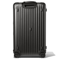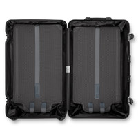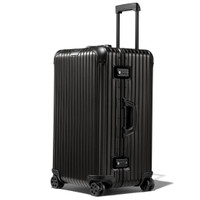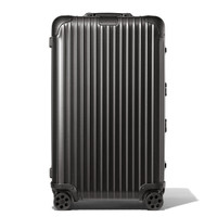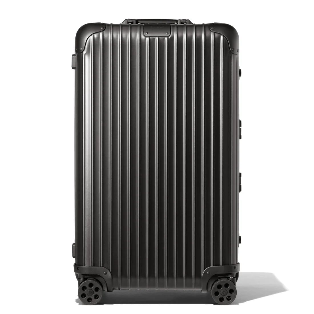 The unmistakable RIMOWA Original aluminum suitcase with its distinctive grooves is regarded as one of the most iconic luggage designs of all time. Remarkably robust and surprisingly lightweight, the RIMOWA Original Trunk in black is an unparalleled example of craftsmanship and innovation. Made from high-end anodized aluminum and designed with a distinctive shape inspired by our original trunks, this hard shell large suitcase is a timeless classic engineered to offer travelers long-lasting performance and optimum capacity for journeys of up to 2 weeks. Designed and engineered in Germany. Includes a complimentary leather luggage tag and sticker set. Key elements TSA-Approved Locks Each of our suitcases features TSA-approved locks that can be opened by security during airline baggage checks without causing any damage. Flex Divider Packed items are kept in perfect order during transit with the height adjustable Flex Divider, which can be adapted to suit your belongings. Multiwheel® System Pioneered by RIMOWA, this high-end system guarantees stable and effortless steering thanks to ball-bearing mounted wheels with cushioned axels. Telescopic Handle Engineered to offer seamless stage-free adjustment for maximum comfort and smooth maneuverability. Size and Weight Measurement 28,8 x 17 x 14,8 INCH Weight 13,4 Lbs Volume 23,6 Gal Materials Outside: Aluminum Inside: Cotton Zippers: KK Metal Handles: Plastic Wheels: Polycarbonate Dividers: Cotton