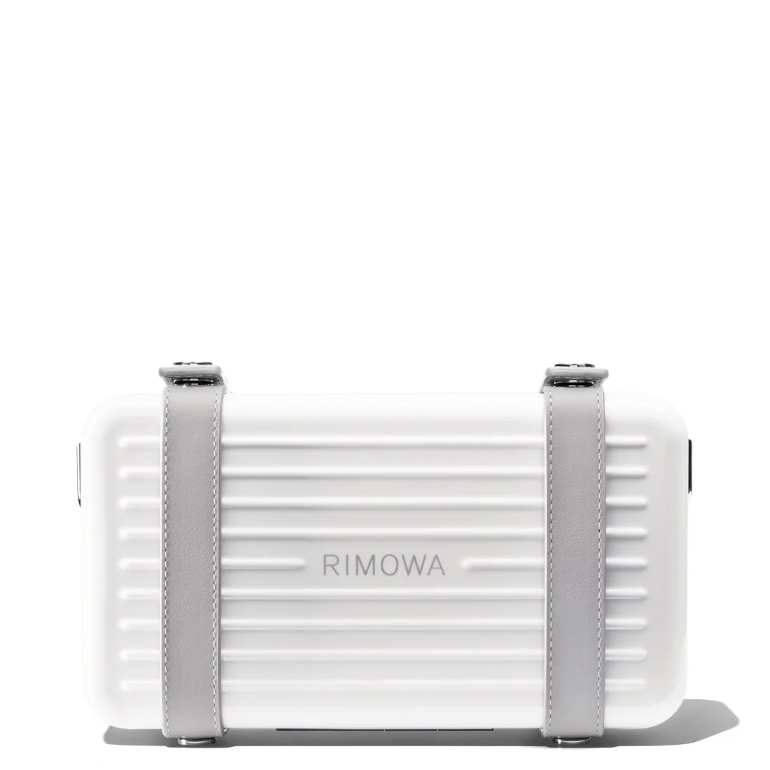 Made in Germany and crafted in ultra-lightweight, dent-resistant grooved polycarbonate, the RIMOWA Polycarbonate Cross-Body Bag in White is a unisex hard-shell crossbody bag meant to house and transport your daily personal essentials. It can be worn with the detachable, adjustable leather body strap or carried like a clutch. Each detail of the RIMOWA Personal Polycarbonate Cross-Body Bag is carefully considered from its color-matched straps and leather lining down to its metal rivets, rings, and hooks finished in silver or gunmetal. Inside, the interior features two open compartments, a zipped pocket and 3 card slots. Key elements Convenient Interior Crafted in full-grain Italian leather and designed to easily fit all your daily belongings easily, the RIMOWA Personal interior features 2 open compartments, 1 zipped pocket, 3 credit card slots. Emblazoned with the RIMOWA logo and coordinates of the brand's historic manufacture in Cologne. Removable Strap Includes an adjustable removable strap made of full-grain Italian leather. Custom Hardware Bespoke D-ring flattens when the strap is not use. Polycarbonate Shell Made in Germany, the RIMOWA Personal is made from our iconic grooved polycarbonate with colors and finishings that match RIMOWA Essential collection suitcases. Size and Weight Measurement 5,1 x 8,5 x 2,8 INCH Weight 1,39 Lbs Volume 0,26 GAL Materials Outside : Glossy Polycarbonate Inside : Full Grain Leather Strap : Full Grain Leather
