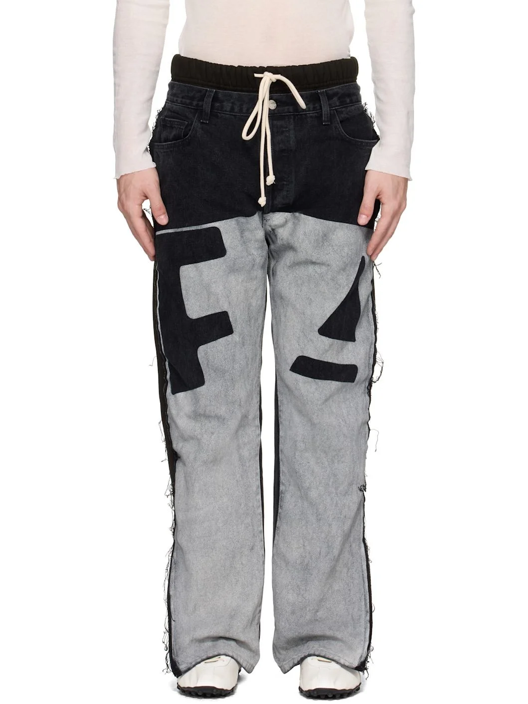 Non-stretch denim and cotton fleece jeans. Fading throughout. · Layered and paneled construction · Drawstring elasticized waistband · Belt loops · Five-pocket styling · Button fly · Logo printed at front legs · Elasticized cuffs · Frayed edge at vented outseams · Logo patch at back waistband Supplier color: Black Body 1: 100% cotton. Body 2: 100% cotton. Trim: 94% cotton, 6% spandex. Made in United States 251268M186006
