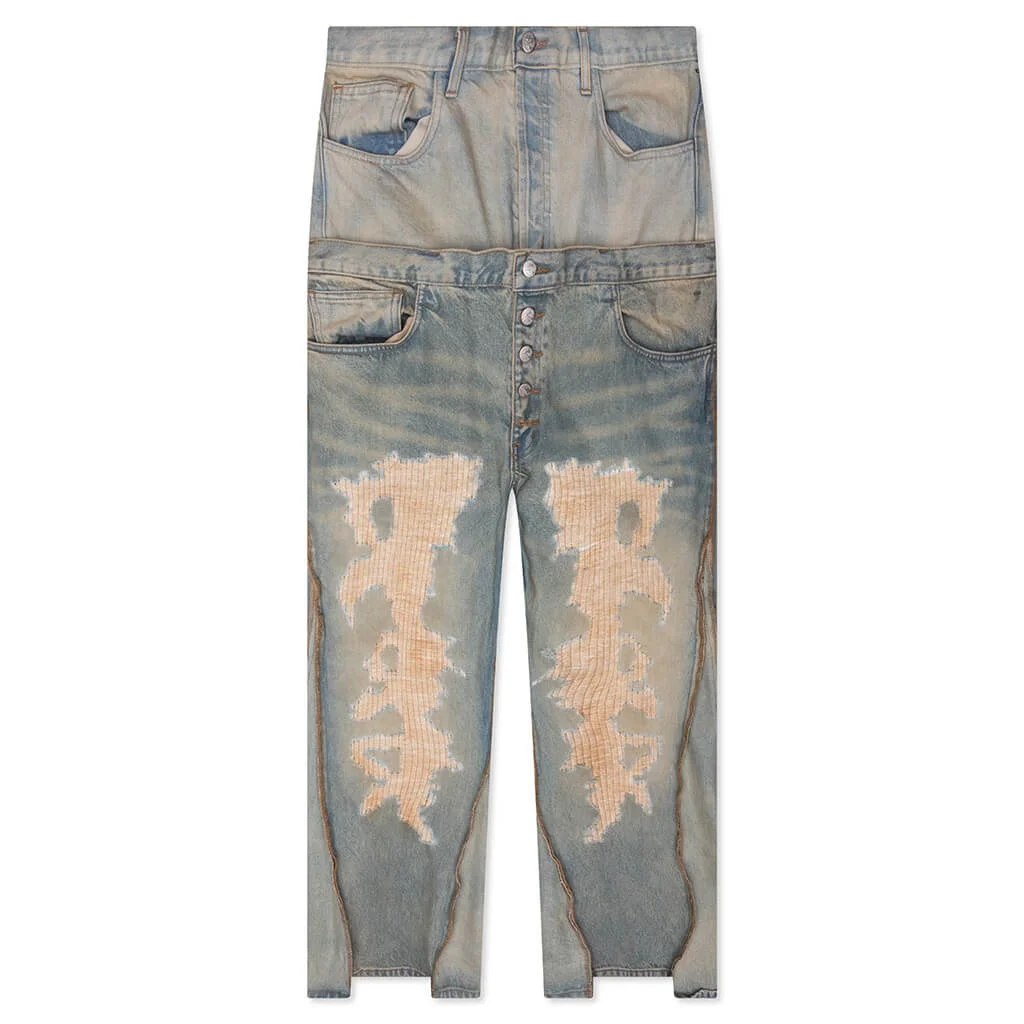 Crafted from premium US denim, the Fathers Garden He Rose 3 Jeans by Rivington Roi Rebis embody raw expression through artful construction. Each pair is hand-distressed and stained, offering a one-of-a-kind finish that blurs the line between utility and experimental design. The dual waistband—complete with both button and drawstring closures—adds a deconstructed, layered look, while tonal repairs and abstract paneling emphasize the handcrafted nature of the silhouette. Finished in 100% cotton and made in Los Angeles, these jeans reflect RRR’s signature approach: rooted in storytelling, rebellion, and reinvention. HRR3 PA55 LIGH - 100% Cotton Denim - Made in Los Angeles - Five-pocket design - Button and drawstring closure - Dual waistband - Hand distressing - Style No: HRR3-PA55-LIND