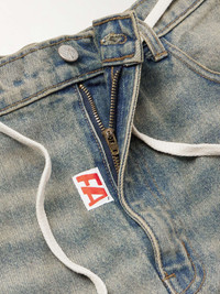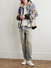 RRR123's 'Fathers Way' straight-leg jeans are made from denim that's faded, whiskered and intentionally distressed for a worn-in feel. They're printed with abstract lines and threaded with a shoelace belt. Wear yours with one of the label's graphic T-shirts. Size & Fit - Fits true to size. Take your normal size - Those with muscular thighs may wish to take the next size up - Slim-straight leg, mid-rise style - Mid-weight, non-stretchy denim - Model is shown wearing a 30 - Model measures: waist size 30, height 6'1"/ 185cm Details & Care - Tonal-blue denim - Button and zip fastening - 100% cotton - Dry clean