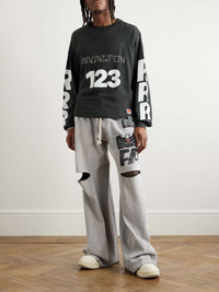 RRR123 considers style imperfections to be virtues, not flaws. Handmade and distressed in Los Angeles, these cotton-jersey sweatpants are screen-printed with faded graphics and have an elasticated drawstring waistband. Size & Fit - Fits true to size. Take your normal size - Wide leg, low-crotch style - Adjustable at the waist - Particularly long in length - Mid-weight, slightly stretchy fabric - Model is shown wearing a M - Model measures: waist size 32, height 6'0"/ 183cm Details & Care - Multicoloured cotton-jersey - 100% cotton - Machine wash