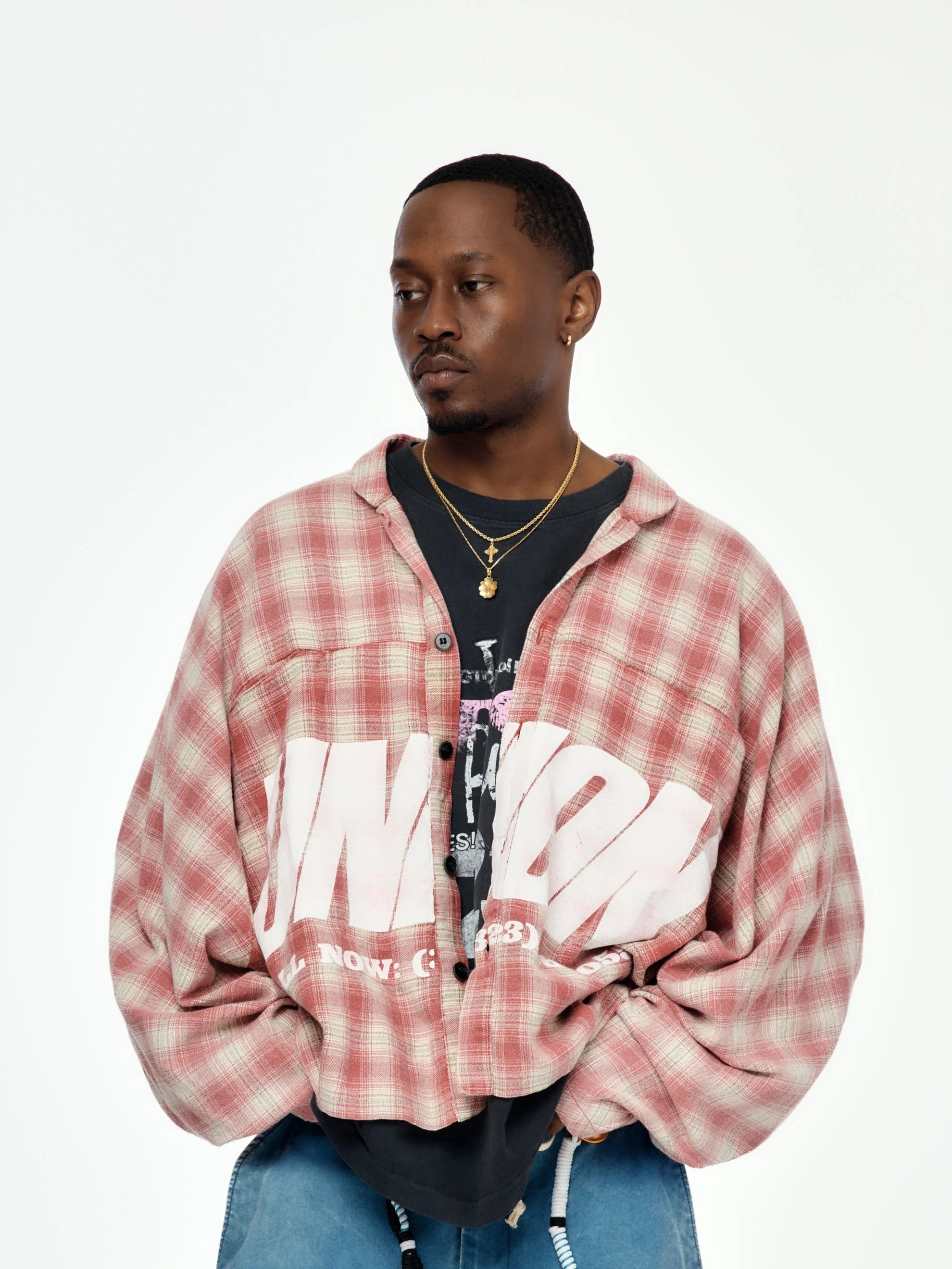 Custom boxed fit flannel, with chest slit pockets, and screen print. 100% cotton Made in USA