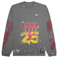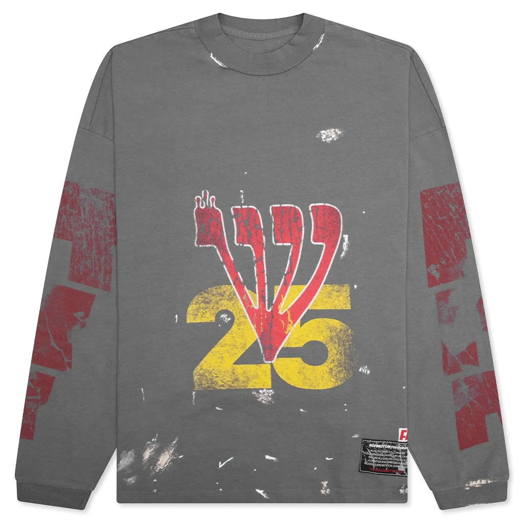 RIVINGTON roi Rebis introduces the Love Stuff L/S Tee in its latest collection. Crafted from 100% cotton, this medium-weight garment is treated with a heavy stone wash, adding a vintage feel. The tee has an oversized, boxy fit. Screen-printed graphics are seen on both the front and back, adding a unique artistic flair. Some finishing touches include the crew neckline and ribbed trims. All color fades, tears, rips, discoloration, and distressing of fabrics are intentional. LVST LS17 GREY - 100% Cotton - Made in Los Angeles - Oversized fit/boxy - Medium-weight jersey - Vintage stone wash - Crew neckline - Ribbed trims - Screen printed graphics - Embroidered details - Style No: LVST-LS17-GREY