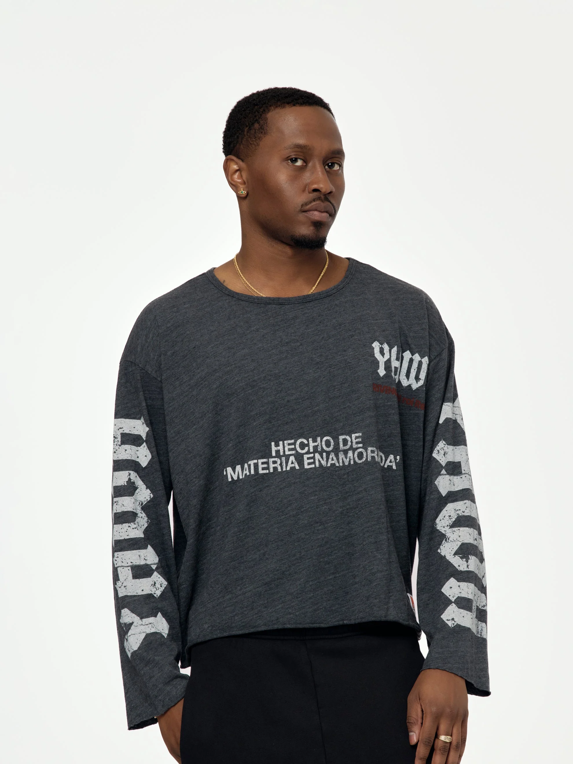 Vintage style black long sleeve tee. Made with high-quality brushed cotton, it features a subtle cropped design and a distressed style screen print. 100% Cotton Model is 5'9 wearing a size Medium. Made in USA