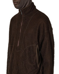 Half zip sweater made in Polartec® Alpha® Direct, dark brown color. Polartec® Alpha® Direct technology that can be in direct contact with skin or other fabric layers. By refining the shape and size of its lofted fibers, this new material increases breathable performance, expands versatile style options, and further reduces overall garment weight. Thermoregulator, versatile for both cold and hot temperatures. Loose, cropped fit for comfort and mobility. Embroidered logo on the front. Front pockets. Elasticized cuffs and hem. Details - Polartec® Alpha® Direct material that can be in direct contact with skin or other fabric layer - Thermoregulator, versatile for both cold and hot temperatures Size and Fit Male model is wearing size M and he is 6,1 ft/1.86m with chest 34.2in/85cm Composition Self: 100% Polyester Made In Lithuania
