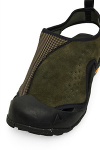 ROA’s Arpy sandal balances breathable comfort with increased durability. The upper, in olive color, is crafted from a dual-material combination: open mesh panels promote airflow for hot-weather wear, while reinforced microfiber overlays provide structure and long-lasting resilience. This thoughtful material pairing ensures a secure, ventilated fit without sacrificing robustness. Details - Dual-material upper: open mesh for breathability, microfiber for durability - Hidden Velcro® closure system for a clean and secure fit - Heel puller for easy entry and removal - Rubber toe cup for added toe protection - EVA midsole for lightweight cushioning and comfort - Vibram® Ecostep outsole for sustainable, high-performance grip Composition UPPER: 54% Polyurethane, 46% Polyester SOLE: 58% Phylon, 38% Rubber Made In China