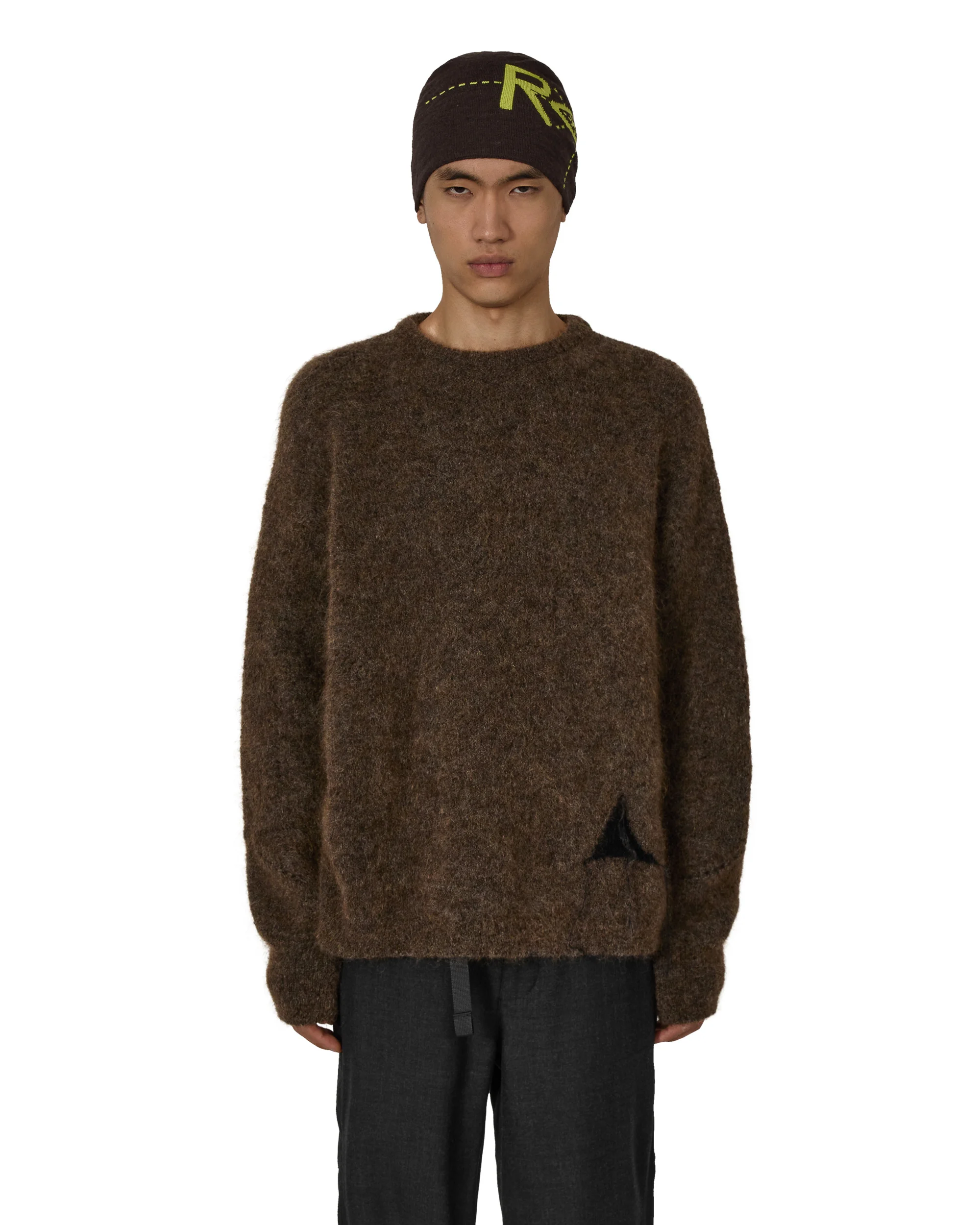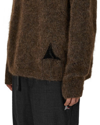 The dropstitch mohair knit crewneck in brown color is crafted from luxuriously soft mohair yarn, offering warmth and a lightweight feel. Featuring an oversized fit, the drop-stitch holes on the body and sleeves add a unique, textured design element, complemented by the melange felted texture. The intarsia logo provides a refined detail, making this crewneck a statement piece. Details - Soft mohair yarn Size and Fit Male model is wearing size M and he is 6 ft/1.85m with chest 33in/84cm Composition Self: 50% Supekid Mohair, 32% Polyamide, 18% Virgin Wool Made In Italy