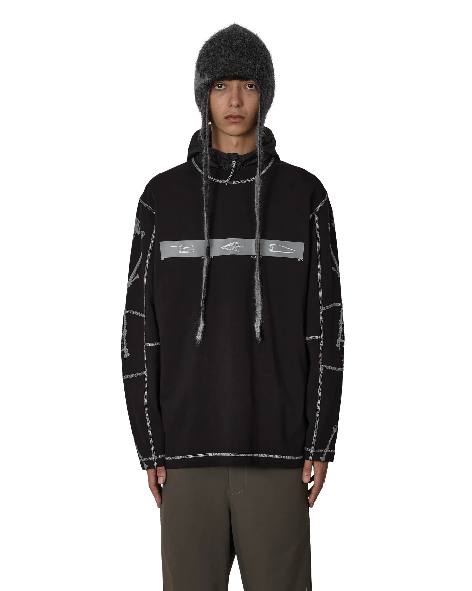 Long sleeve graphic tee made of heavy-weight organic cotton jersey, black color. Printed contrasting design on the front, and printed design on the back in silver, moon mist and pewter color. Ribbed collar. Details - Heavy-weight organic cotton jersey Size and Fit Male model is wearing size M and he is 6 ft/1.85m with chest 33in/84cm Composition Self: 100% Cotton Made In Portugal