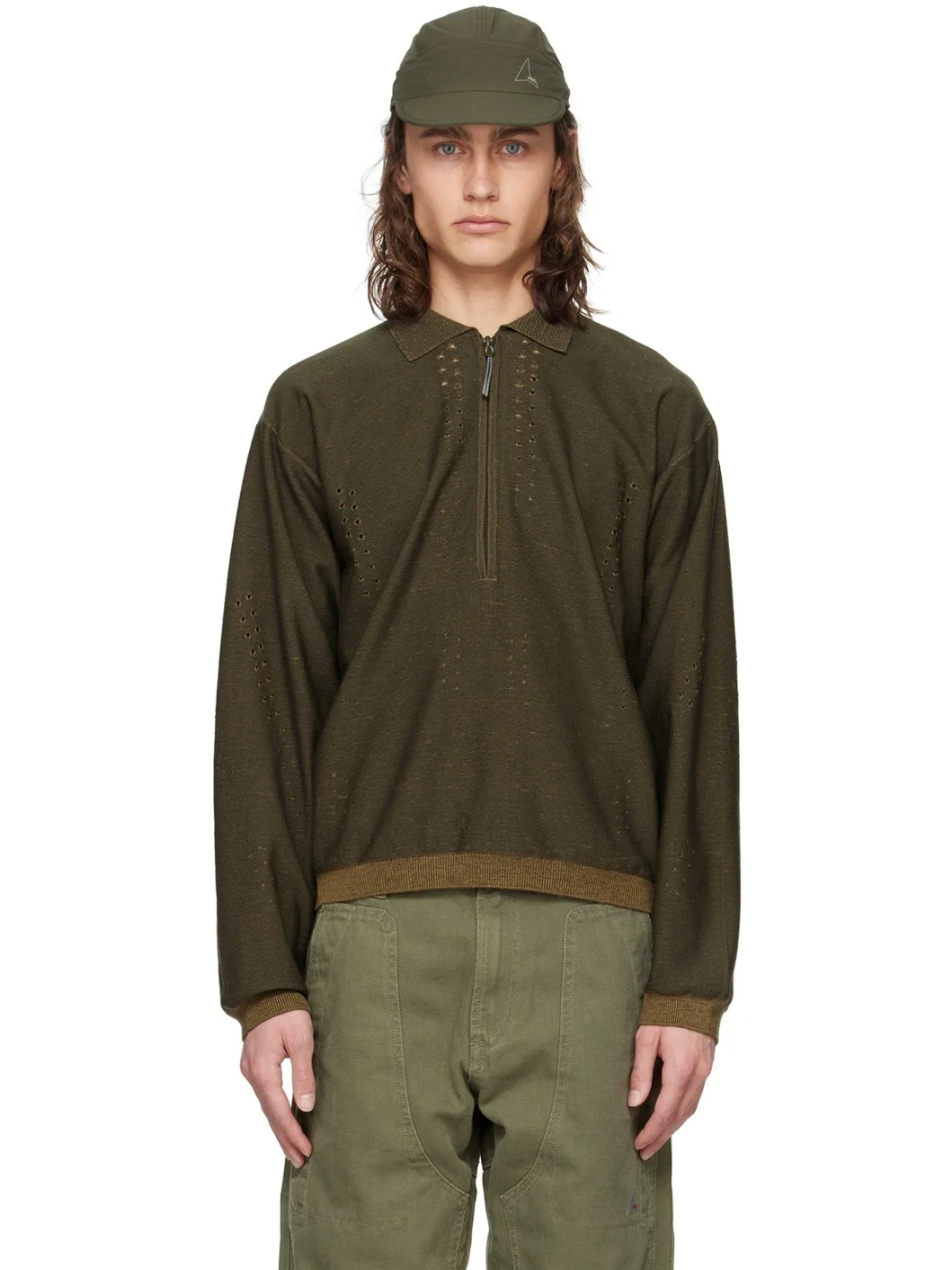 Knit cotton- and merino wool-blend polo. Perforated detailing throughout. · Rib knit spread collar, hem, and cuffs · Half-zip closure Supplier color: Military green
