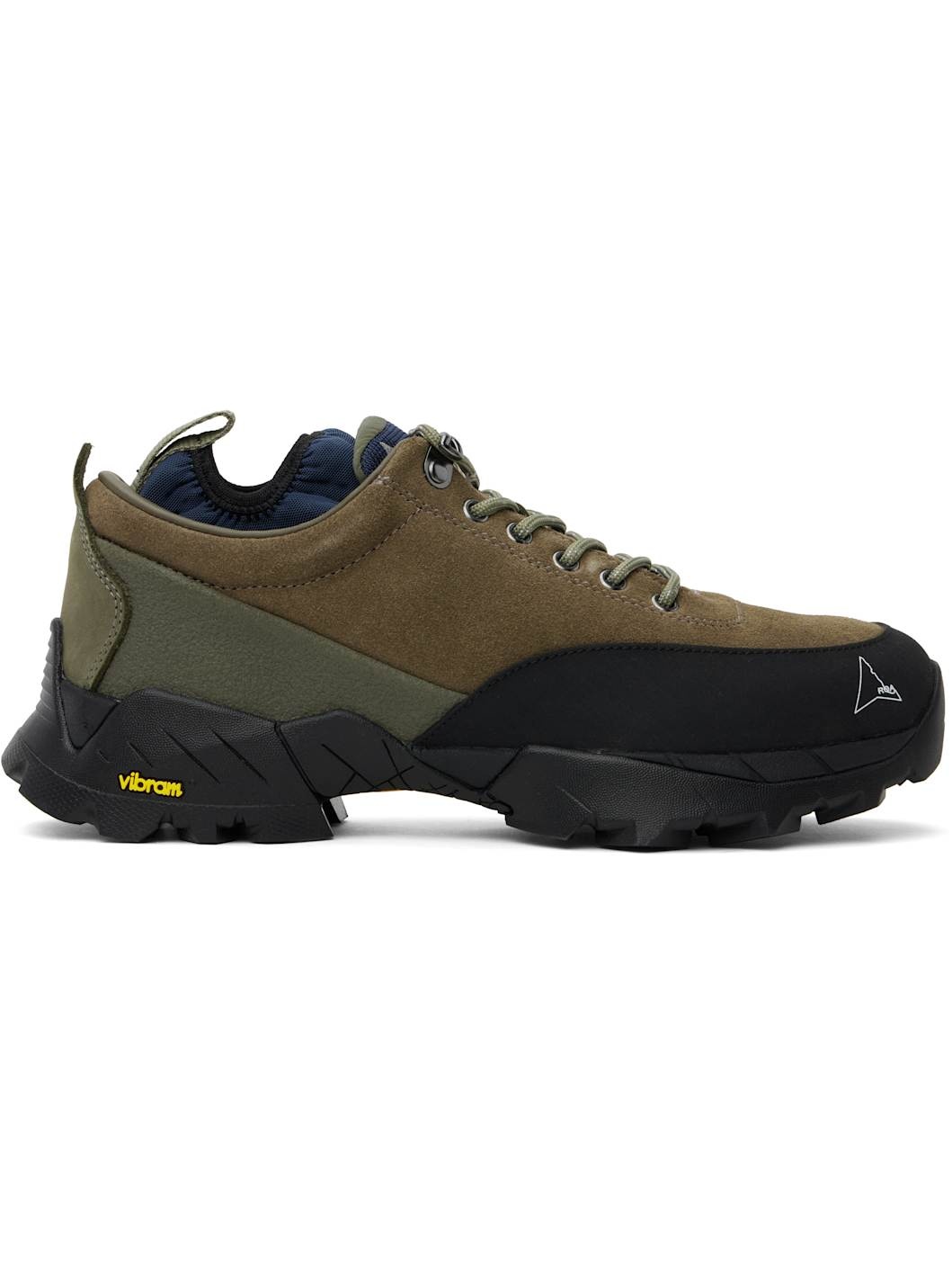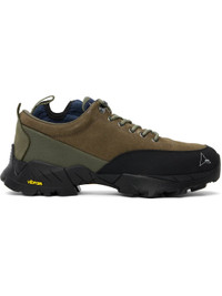 Low-top calfskin suede sneakers in khaki. · Water-repellent · Logo printed at rubber cap toe · Lace-up closure · Logo embroidered at padded tongue · Pull-loop at elasticized sock-style collar · Crepe overlay at sides · Logo embroidered at inner side · Pull-tab at calfskin nubuck heel counter · Bonded jersey lining · Treaded Vibram® Megagrip rubber sole Supplier color: Grey blue