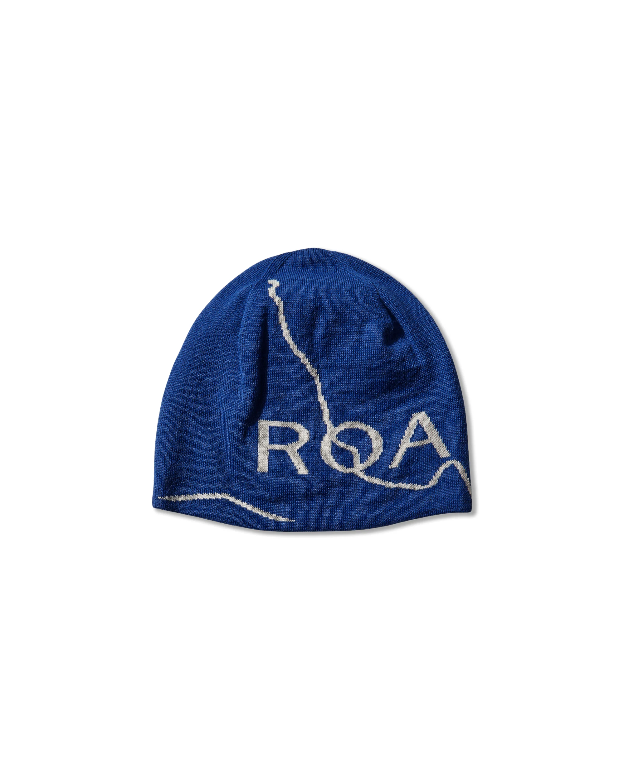 Merino wool and polyester beanie in blue color featuring a contrast knit logo design. The natural wicking abilities of wool fibers help generating a comfortably dry warmth and a sensation of freshness even in humid conditions. Details - Contrasting knit ROA logo design - Natural moisture-wicking properties Composition SELF: 50% Virgin Wool, 50% Acrylic Made In Italy