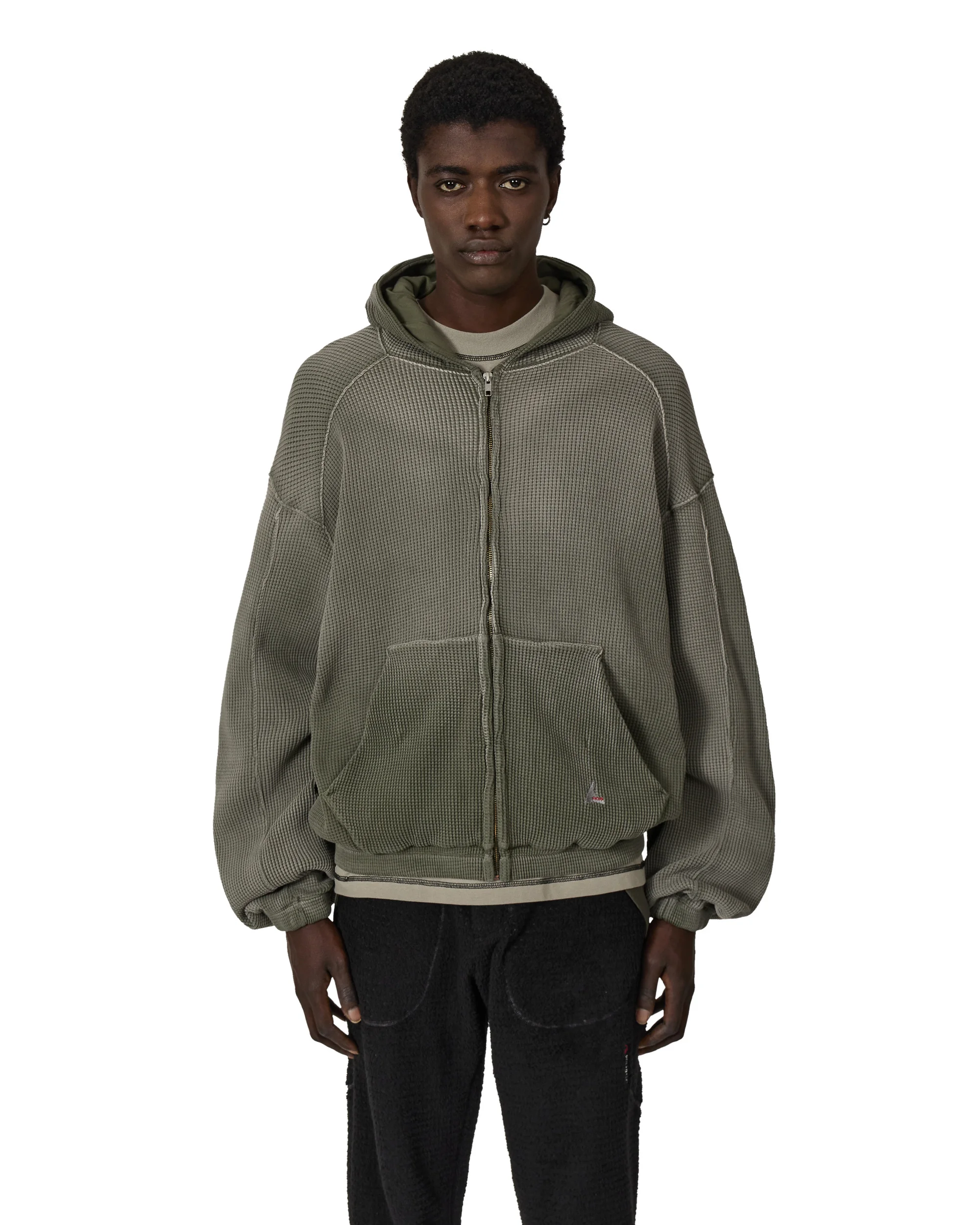 The Bee Sun Faded Waffle zip-up hoodie in grape leaf color is crafted from faded, heavy waffle jersey. Designed with a boxy fit for a relaxed silhouette, it features a zipped center front for easy layering. Elasticated cuffs and hem provide a snug fit, while the embroidered ROA logo on the front pocket adds a subtle touch of detail. Details - Faded heavy waffle jersey Size and Fit Male model is wearing size M and he is 6,1 ft/1.86m with chest 34.2in/85cm Composition Self: 100% Cotton Made In Portugal