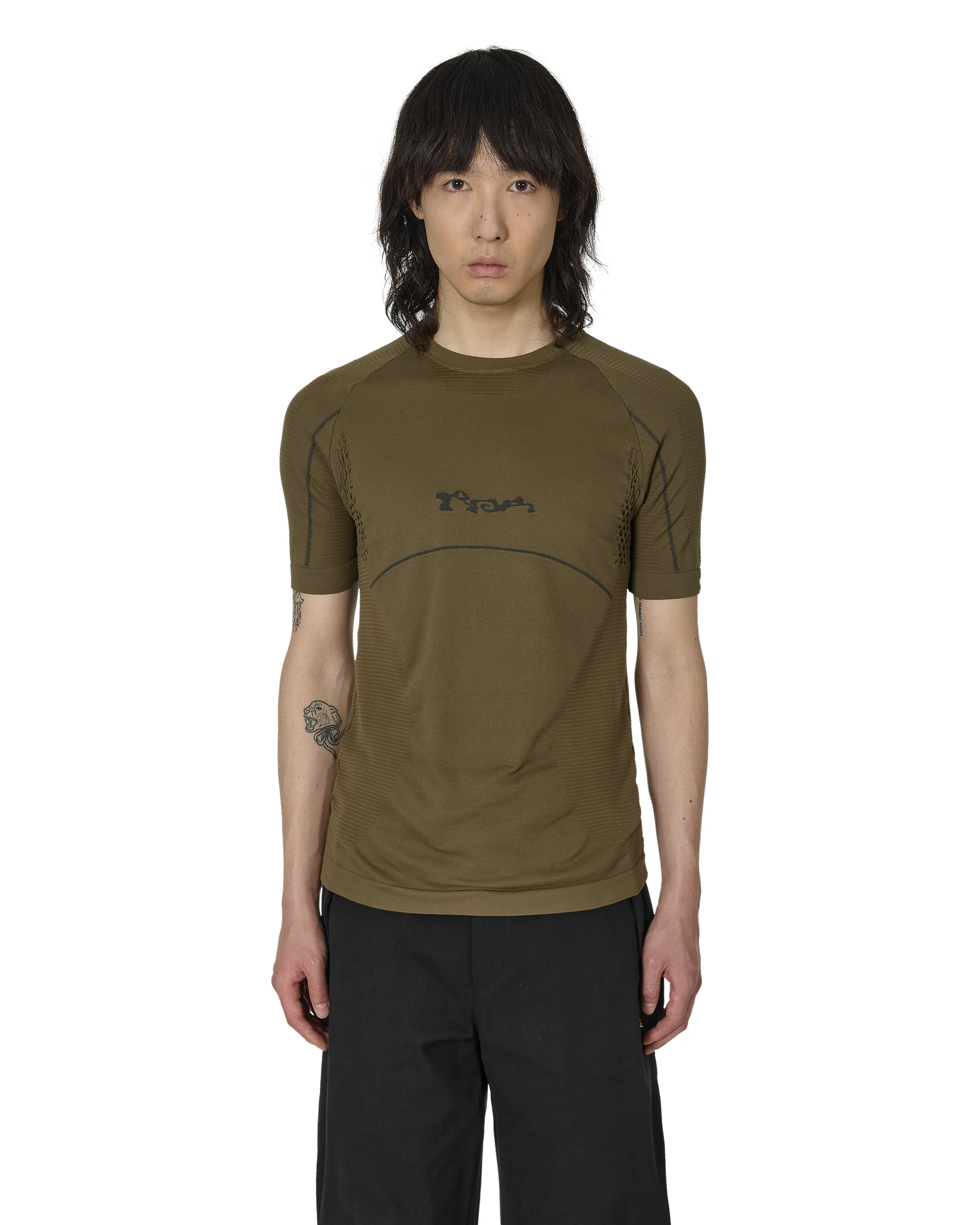 3D seamlesst-shirt in dark olive color, made of Nilit Breeze fabric for exceptional comfort. Its advanced technical design, which includes a contrasting knit, ensures efficient cooling effect, heat release, and UV protection, guaranteeing a tight and secure fit. Details - Nilit Breeze fabric - Contrasting knit design - Efficient cooling effect, heat release, and UV protection - Tight and secure fit Size and Fit Male model is wearing size M and he is 5.9 ft/1.82m with chest 33.5in/85cm Composition SELF 97% Polyamide 3% Elastane Made In Italy