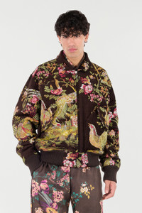 ID: VRT462-FY103-ZO047 An emblem of creative and refined luxury, this wool-blend bomber jacket features a colorful all-over embroidered pattern depicting a natural landscape with pheasants and flowering branches. The model also has two convenient pockets with flap and hook-and-loop fastening on the front, ribbed hem and cuffs, and a front zip fastening with pull-tab in the shape of the unmistakable tiger Fang, for a feline touch in pure Roberto Cavalli style. Details - Wool-blend bomber jacket - Pattern with pheasants, flowering branches and all-over natural landscape - Long sleeves - Rib-knit cuffs and hem - Rounded neck - Metal chain hanger loop - Roberto Cavalli label on the inside collar - Front pockets with flap and hook-and-loop fastening - Front zipper fastening - Tiger Fang-shaped pull-tab