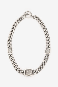 ID: VRG003-AM258-05626 A round necklace inspired by urban aesthetics by Roberto Cavalli, in which a chain with thick links is interspersed with three RC monogram charms with an imposing appearance and an eye-catching hammered finish. Details - Chain choker necklace with thick links - Three RC monogram charms with hammered finish - Roberto Cavalli logo tag on the inside of the central charm - T-bar closure - Made in Italy