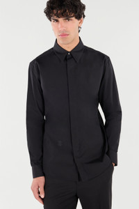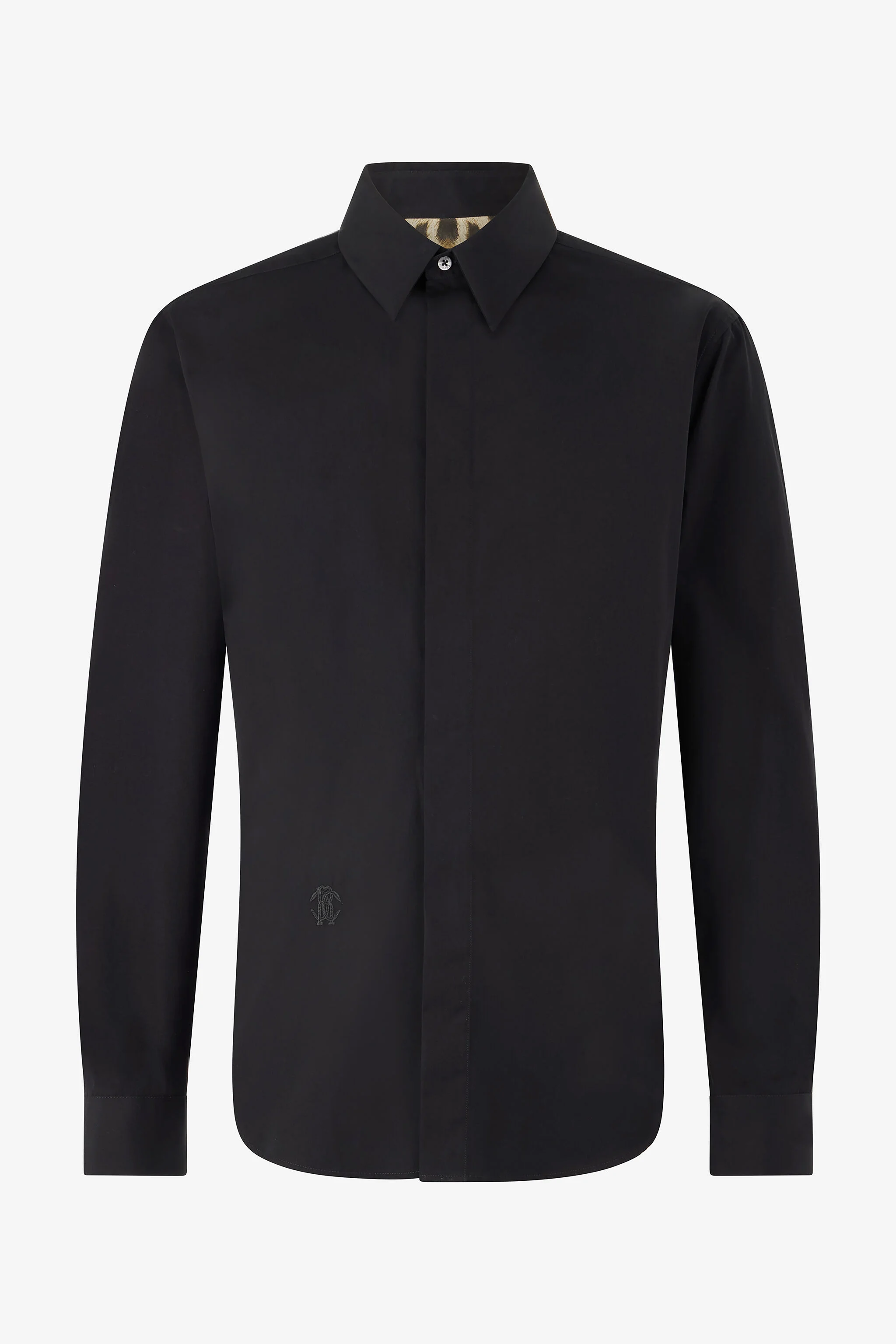 ID: VRT700-CH026-05051 A key reinterpretation by Roberto Cavalli of the classic solid-color men's shirt, this pure cotton version is embellished with the emblematic Mirror Snake Monogram embroidered on the front and is animated by a contrasting interior with an animal print. A garment with a design that is both clean and bold, capable of instantly adding a bold touch to your daytime or evening look. Details - Pure cotton shirt - Mirror Snake Monogram embroidered at the bottom on the front - Pointed collar - Long sleeves - Cuffs with buttons - Rear yoke - Inner with animal print