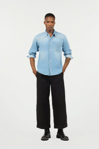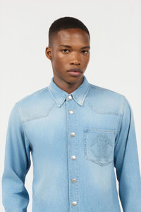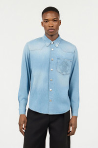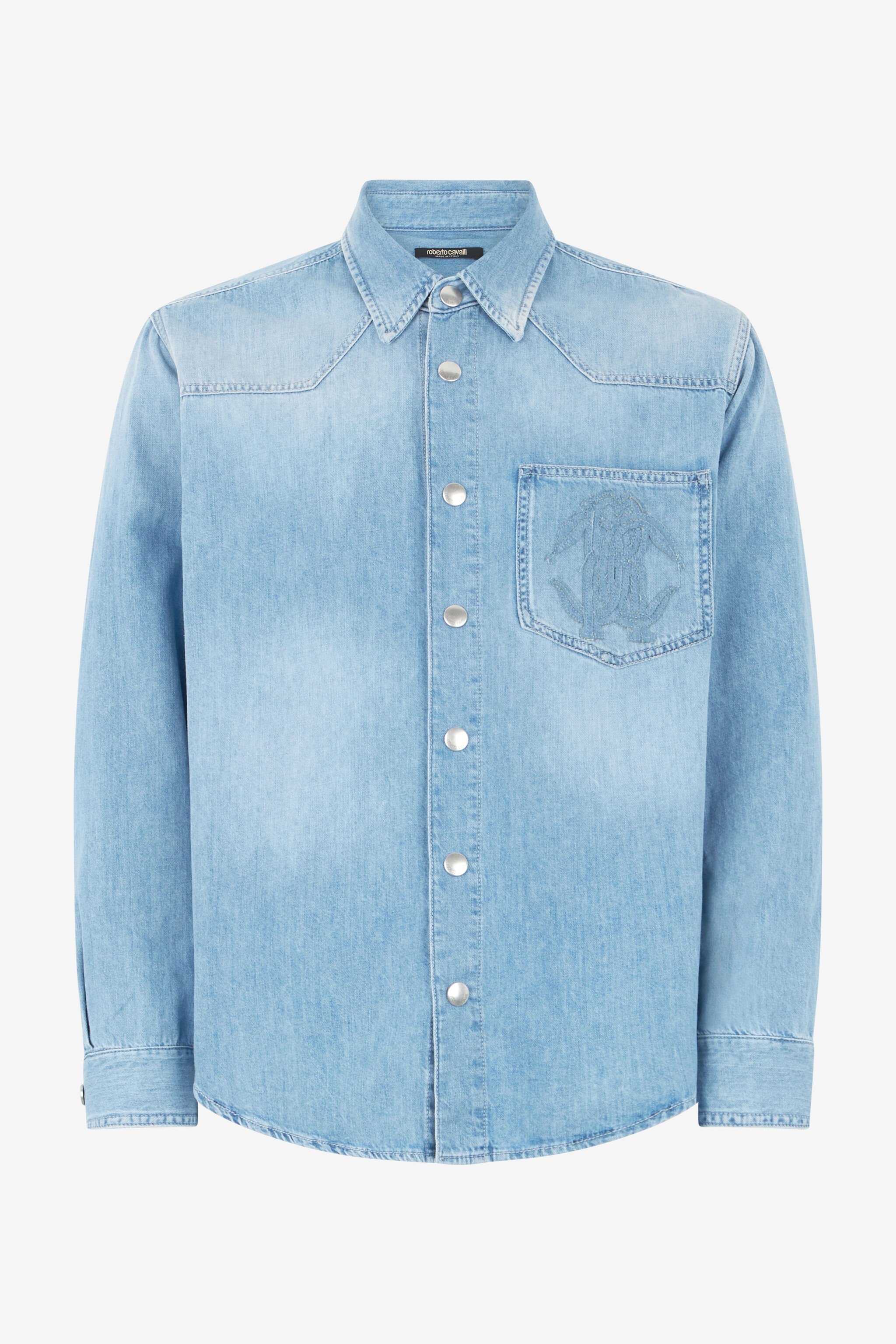 ID: URJ728-DL006-05112 This pure cotton denim shirt by Roberto Cavalli is destined to become an authentic must-have in the men's wardrobe. The model has slight fading on the surface and a breast pocket featuring the tonal Mirror Snake Monogram, an unmistakable tribute to the elegance of the reptilian world that has always fascinated the Maison. Details - Pure cotton denim shirt - Classic collar - Surface discoloration - Breast pocket embroidered with Mirror Snake Monogram - Long sleeves - Cuffs with button - Press-stud fastening on front - Roberto Cavalli label on the inside collar - Made in Italy Care & maintenance External fabric:100% Cotton