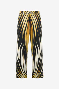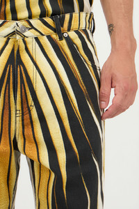 ID: VRJ210-4NP79-01080 Unleash your untamed spirit with the Ray of Gold jeans. A radiant, all-over animalier print captures the light and the eye, evoking the magnificent streaks of a golden sunset. These jeans are a bold statement piece, designed for the man who is not afraid to stand out. The classic five-pocket silhouette is reimagined with Cavalli's signature opulence, offering a powerful blend of audacious style and urban edge. The model is 185 cm / 6'1" tall and wears size L / 48 IT. Details - Jeans with all-over Ray of Gold print - Crafted from high-quality cotton denim for comfort and durability - Classic five-pocket design - Belt loops - Front zip and button closure - Leather back patch with Roberto Cavalli logo - Perfect for a statement look or to elevate a daytime outfit - Made in Italy Care & maintenance External fabric:100% Cotton / Lining:65% Polyester, 35% Cotton