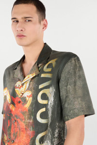 ID: URT761-4QN69-Z0366 Details - Shirt made of pure silk - All-over faded snake-skin effect print - Used-effect print with roses, snake, and logo - Short sleeves - Bowling collar - Front button closure - Roberto Cavalli label inside the collar - Made in Italy Care & maintenance External fabric:100% Silk