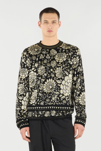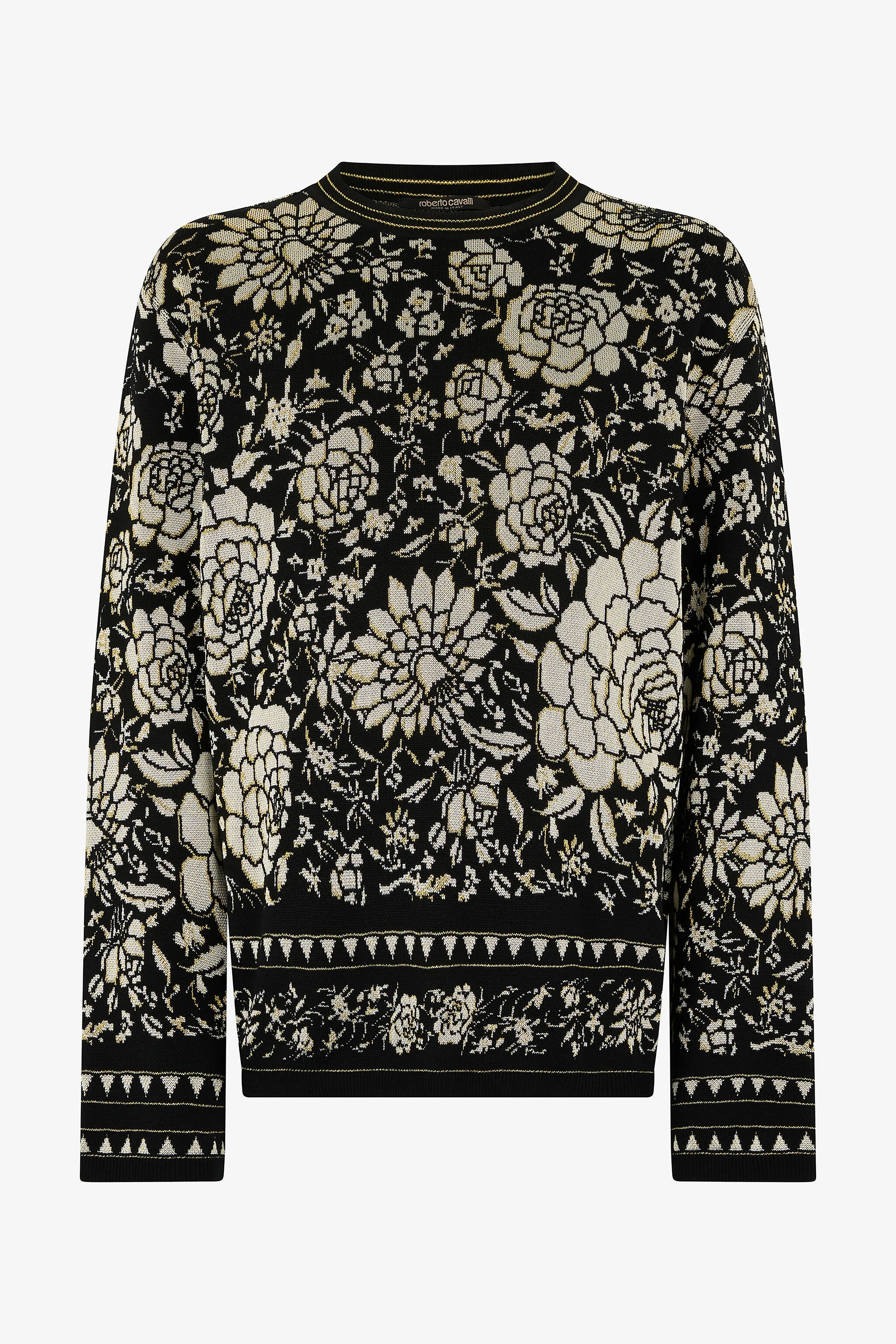 ID: VNM604-MQ027-D0477 This soft wool-blend sweater by Roberto Cavalli features a refined all-over flower motif and is finished with thin contrasting stripes that embellish the crew neck, cuffs and hem. A garment of effortless elegance, ready to accompany you on any occasion. Details - Wool-blend sweater - Crew-neck - Long sleeves - All-over floral pattern - Striped pattern on neck, cuffs and hem - Roberto Cavalli label on the inside collar - Made in Italy