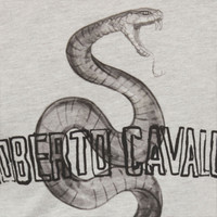 ID: ROT60D-JD055-05020 This short-sleeve crew neck T-shirt, crafted from a cotton blend, embodies the distinctive codes of the Roberto Cavalli universe. The design stands out with a large front print featuring the Maison's iconic logo overlaid with a majestic snake in an attacking pose, symbolizing the power of the reptile world. Details - T-shirt in cotton blend - Front print with Roberto Cavalli logo and snake - Crew neck - Short sleeves - Roberto Cavalli label inside the collar Care & maintenance External fabric:65% Cotton, 35% Polyester
