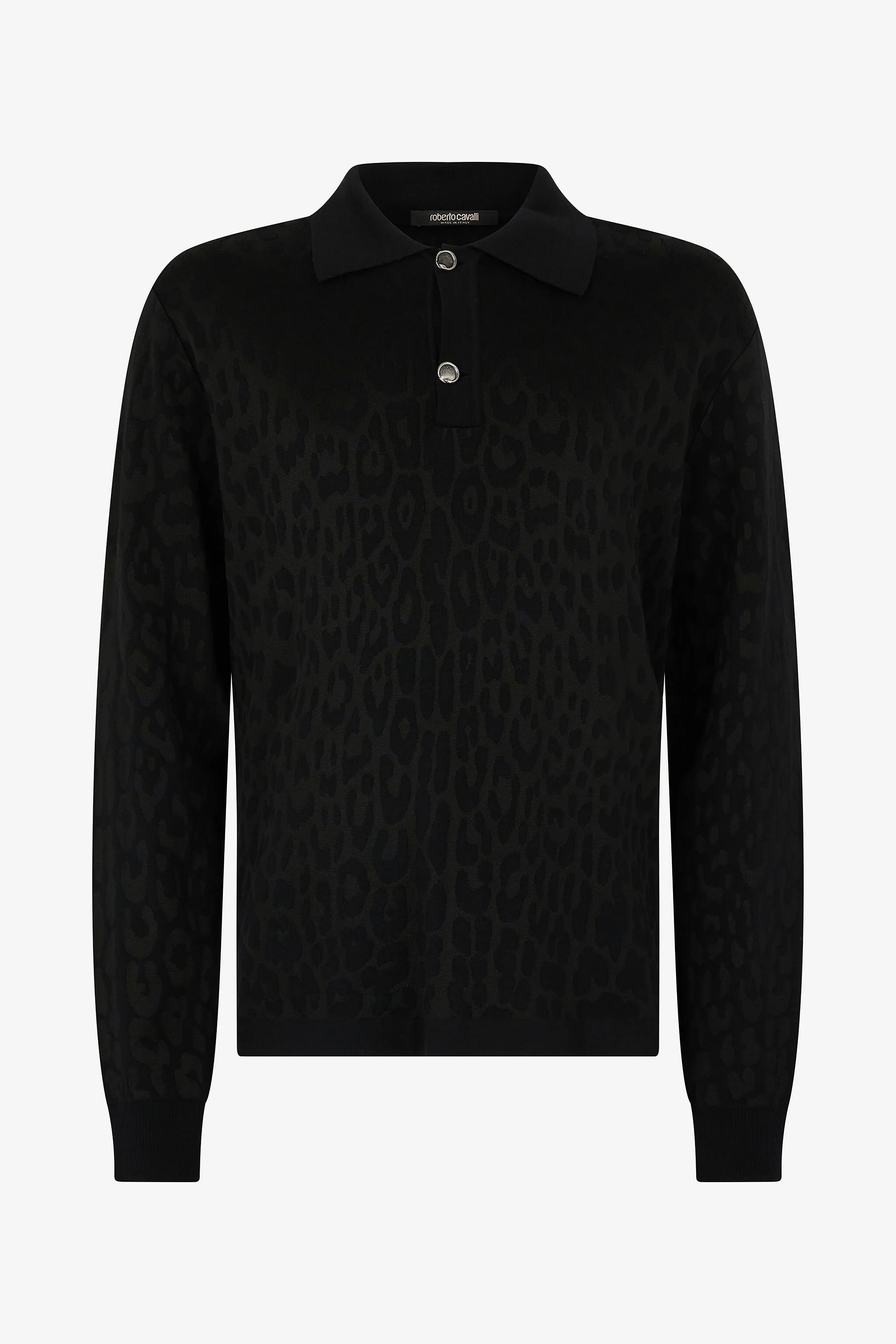 ID: VRM641-MQ028-05051 The elegance of the feline world, which has always been a source of inspiration for Roberto Cavalli, is expressed in this wool-blend knitted polo through a monochrome all-over Jaguar Skin pattern, to give a touch of wild elegance to your everyday looks. Details - Wool-blend knitted polo - Long sleeves - Classic collar - Placket with two branded buttons - All-over solid-color Jaguar Skin print - Rib-knit cuffs and hem - Roberto Cavalli label on the inside collar - Made in Italy