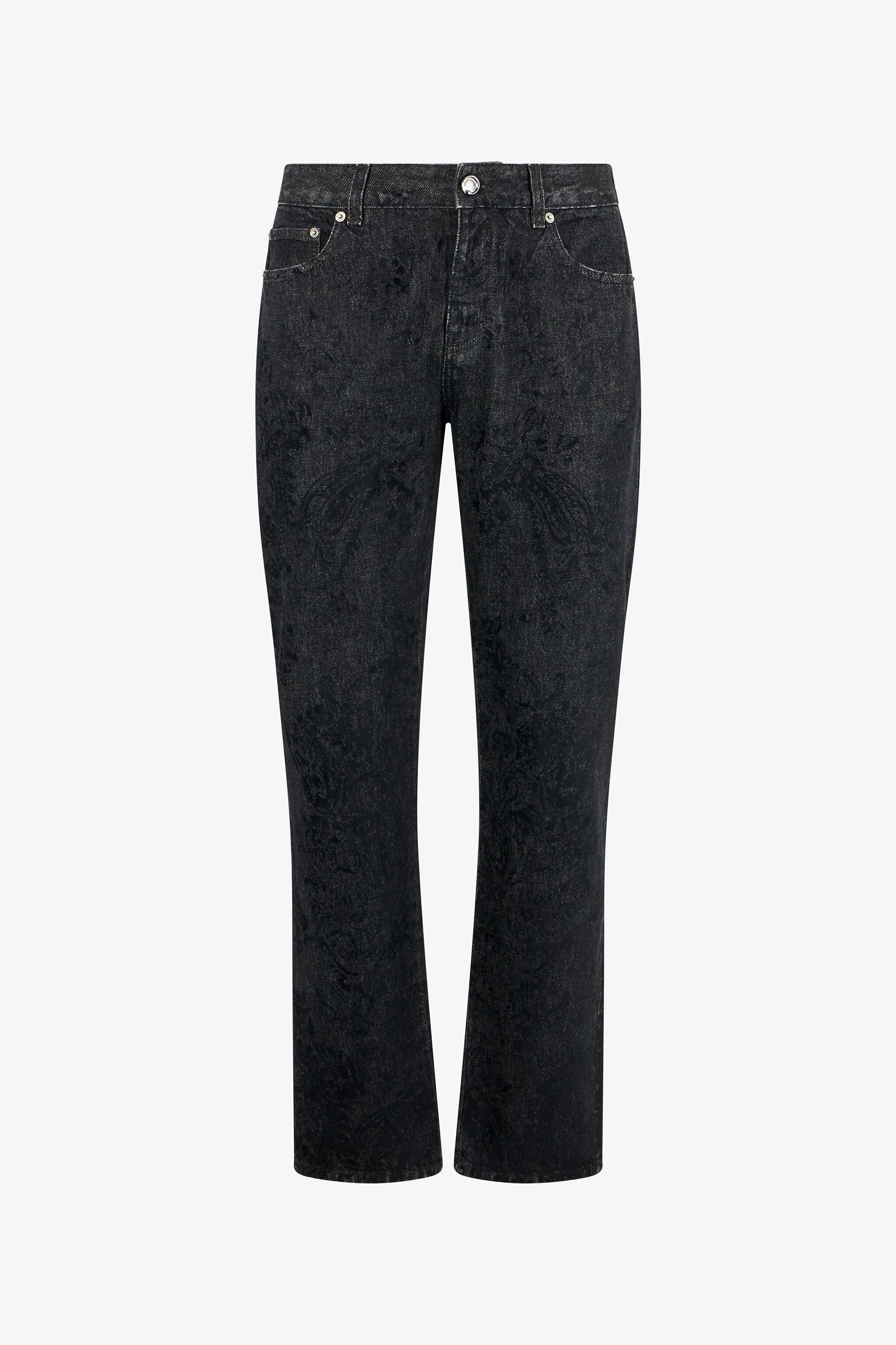 ID: WRJ209-VT036-05051 These jeans embody the timeless elegance of black denim, enhanced by a delicate pattern that adds a sophisticated touch. The straight-leg silhouette flatters the figure, while refined details draw the eye. Perfect for anyone seeking a versatile yet distinctive piece, able to transform every outfit into a true style experience. Details - Delicate motif on deep black fabric - Straight silhouette that flatters the figure - Refined, distinctive detailing - Denim that blends elegance with versatility