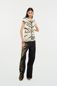 ID: UKJ207-KON84-D0888 The wild elegance that has always defined the Roberto Cavalli universe comes to life in these five-pocket palazzo jeans. The iconic Zebra print, reinterpreted in a refined version, lights up with golden reflections and boldly envelops the outer side of one leg, creating a sophisticated and striking contrast. The garment is further embellished with a golden charm with a Mirror Snake Monogram on one of the belt loops, a tribute to the brand's DNA and the charm exerted by the reptile world. Details - Pure cotton denim jeans - Cotton lining - Five-pocket design - Palazzo cut with loose, flared leg - Belt loops - Golden charm with Mirror Snake Monogram on a belt loop - Roberto Cavalli logo label on the back - Front branded button fastening Care & maintenance External fabric:100% Cotton / Lining:100% Cotton