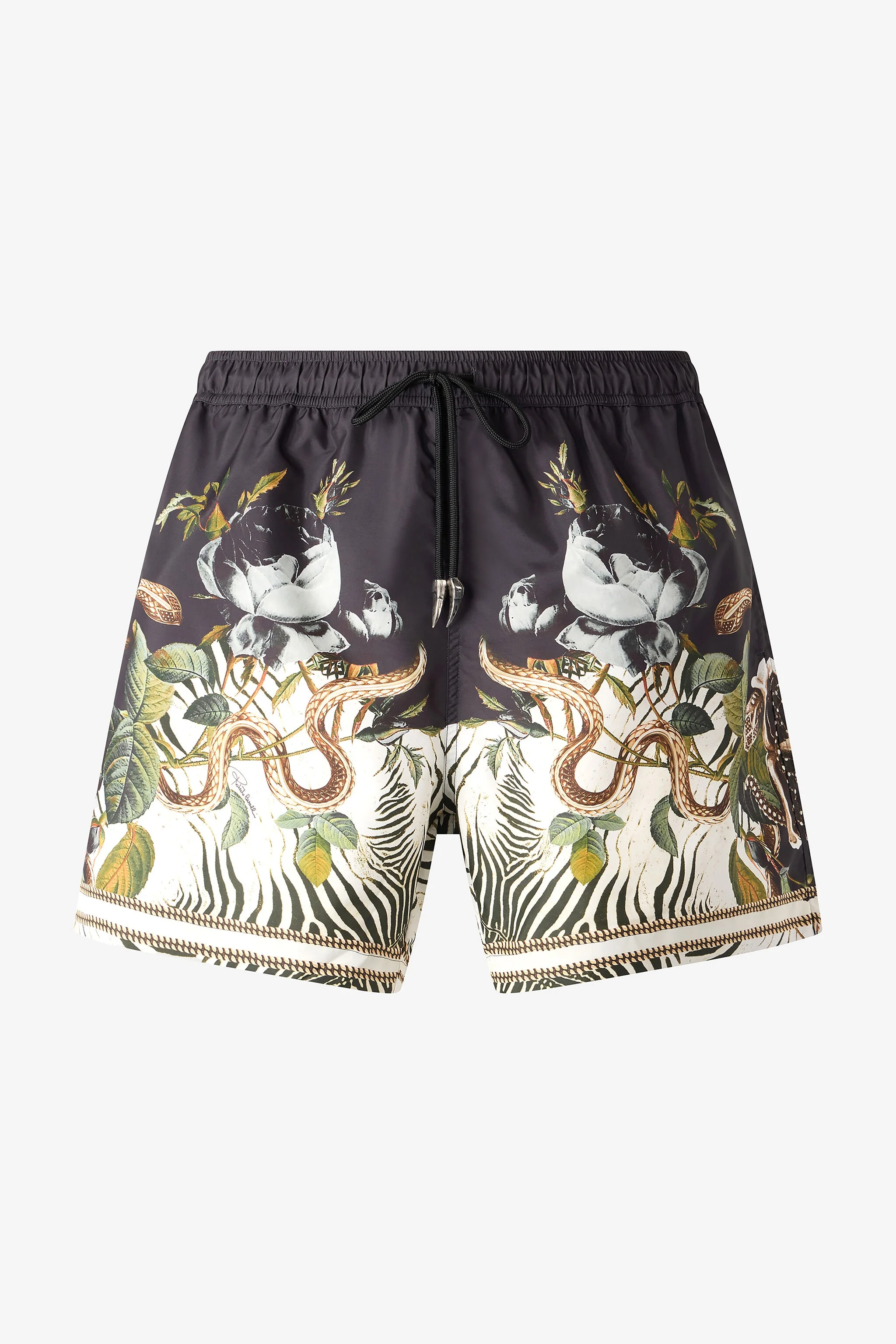 ID: URH00S-5RN71-D0141 These swim shorts from Roberto Cavalli are given some verve by the refined maxi-rose print, paired with the signature Zebra motif and traversed by a bold snake, a tribute to the wild elegance that has always distinguished the brand. The piece is further embellished by the nods to the brand's signature style, represented by the Tiger Fang that completes the drawstring on the waist and the label with Mirror Snake Monogram that finishes the back welt pocket. Details - Lined swim shorts - Maxi-rose, zebra and snake print - Drawstring waist with metallic Fang-shaped aglets - Label with Mirror Snake Monogram on the back welt pocket - Side pockets Care & maintenance External fabric:100% Polyester / Lining:82% Polybutylene terephthalate, 18% Elastane