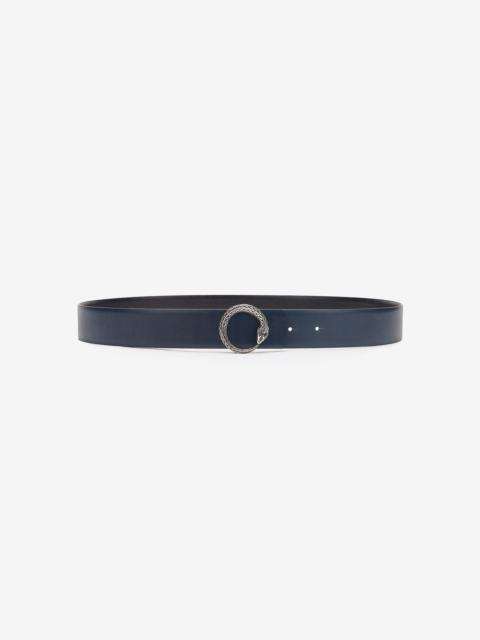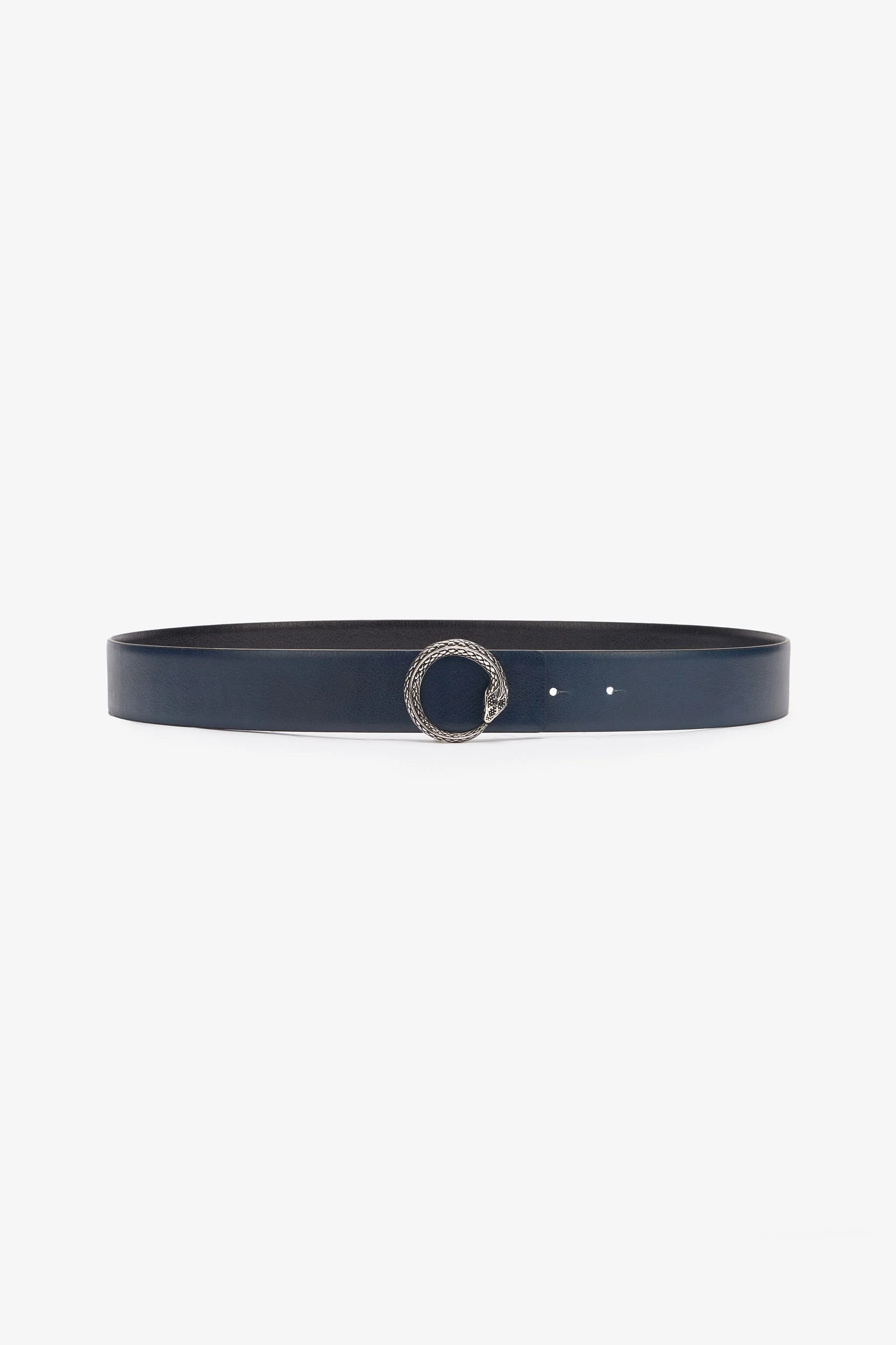ID: URC001-PZU03-D0174 This belt by Roberto Cavalli is crafted entirely from solid-color leather with a timeless hammered effect, which is emphasized even more by the contrasting interior. The buckle, an homage to the reptilian universe, consists of a silver-tone snake with richly embellished scales that joins head and tail to form a circle. Details - Hammered leather belt - Snake-shaped buckle - Scales and embossed details - Silver-tone finish - Contrasting interior with leather lining Care & maintenance Leather - Fur:Bos Taurus / Lining:100% Bos Taurus