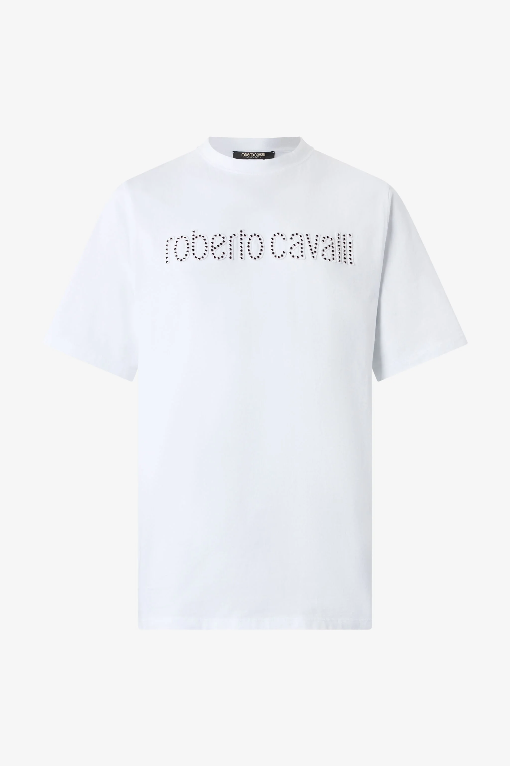 ID: URT61I-JD060-00052 Embrace effortless elegance with this T-shirt with a minimalist cut, featuring the Roberto Cavalli logo embroidered on the front and embellished with mini studs, an authentic tribute to the Maison's DNA. Details - Pure cotton T-shirt - Roberto Cavalli logo with mini stud embellishment - Crew neck - Short sleeves - Roberto Cavalli label on the inside collar - Made in Italy Care & maintenance External fabric:100% Cotton