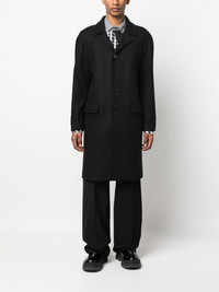 long single-breasted coat black virgin wool-cashmere blend wide notch lapels front button fastening long sleeves buttoned cuffs two side flap pockets central rear vent long length Made in Italy Composition Virgin Wool 75%, Polyamide 20%, Cashmere 5% SIZE & FIT Model measurements Height 6 ft 2 in(1.88 m) Bust/Chest 35.03 in(89 cm) Hips 35.82 in(91 cm) Waist 27.95 in(71 cm) FittingInformation This piece fits true to size. We recommend you get your regular size Cut for a loose fit Made with a mid-weight non-stretch fabric
