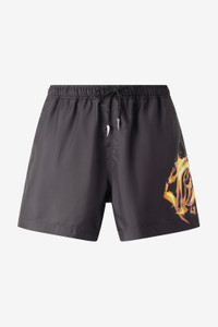 ID: URH00R-SB082-E0215 The minimalist design of these swim shorts is given some verve by the brand’s most iconic custom details: the RC Monogram, revisited in the form of a fiery flame-covered print on the leg, the Tiger Fang transformed into metal aglets on the drawstring and the label with the Mirror Snake Monogram on the back welt pocket. Details - Lined swim shorts - RC Monogram print covered in flames on one leg - Label with Mirror Snake Monogram on the back welt pocket - Drawstring waist with metallic Fang-shaped aglets - Side pockets Care & maintenance External fabric:100% Polyester / Lining:82% Polybutylene terephthalate, 18% Elastane