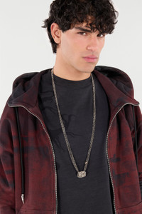 ID: VRG001-AM258-05626 Roberto Cavalli has designed a long necklace inspired by urban aesthetics, characterized by two thin chains that converge in the RC monogram pendant with a sturdy appearance and an eye-catching hammered finish. Details - Necklace with a long design - Thin double chain - RC monogram pendant with hammered finish - Circular medallion with Mirror Snake Monogram on one side and Roberto Cavalli logo on the other - Adjustable fastening with clasp