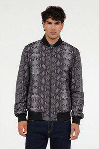 ID: QOT40D-5LE05-05051 The untamed elegance of the reptile world, a constant source of inspiration for Roberto Cavalli, is embodied in this padded bomber jacket featuring an all-over Python print. The piece is finished with contrasting collar, cuffs, and hem, two side pockets, and a front zip closure. Details - Padded bomber with Python print - Subtle Roberto Cavalli signatures on the garment's surface - Two side pockets - Contrasting collar, cuffs, and hem - Front zip closure - Logo-embossed zipper pull - Metal hanger loop with Roberto Cavalli tag - Roberto Cavalli label inside the collar Care & maintenance External fabric:100% Polyester / Secondary fabric:98% Polyester, 2% Elastane / Lining:100% Polyester / Padding (Fiber):100% Polyester