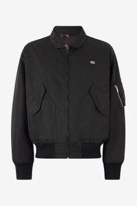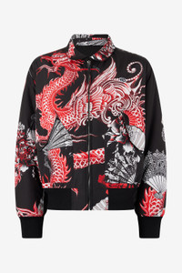 ID: VNT473-SB064-05051 "A symbol of effortless luxury, the bomber jacket is revisited by Roberto Cavalli in a reversible design for an even more customizable look. The garment features a solid-color side and a side decorated with an all-over print depicting a powerful and sinuous dragon accompanied by oriental-style fans. A small RC monogram patch stands out on the chest, the unmistakable signature of the Maison, while the functional details are provided by the two flap pockets on the front and the multi-pocket with zip on one sleeve. Details - Reversible bomber jacket - One side in a solid color, one side with a dragon and all-over fans - Rib-knit on cuffs and hem - Side pockets with flap - Functional multi-pocket with a zip on one sleeve - Rounded neck - Patch with RC Monogram on the chest - Front zipper fastening