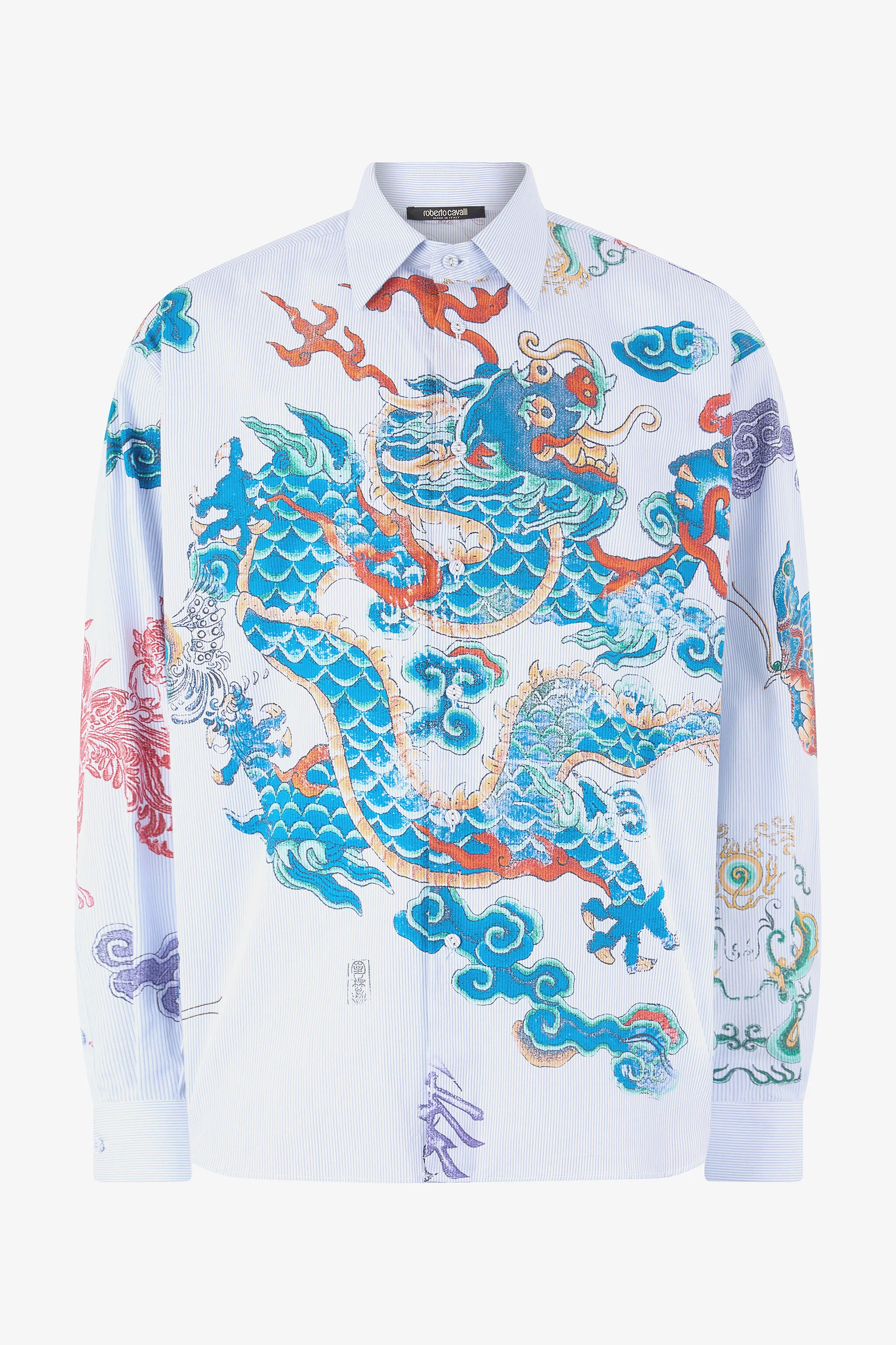ID: VRT722-CH106-Z0533 The creative flair of the Maison Roberto Cavalli finds full expression in this pure cotton shirt featuring a thin striped background, decorated with a lively butterfly and flower pattern on the back and sleeves, and a placed print with a maxi colored dragon surrounded by clouds on the front. Details - Pure cotton shirt - Background with micro-striped pattern - Colorful flower and butterfly pattern on the back and sleeves - Placed pattern with dragon and clouds on the front - Pointed collar - Long sleeves - Cuffs with buttons - Front button fastening - Roberto Cavalli label on the inside collar - Made in Italy